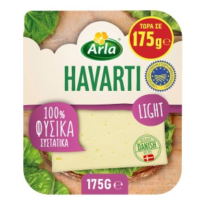 ARLA HAVARTI, ένας αυθεντικός δανέζικος τύπος ημίσκληρου τυριού που παράγεται εδώ και πολλές γενιές. Δημιουργήθηκε από τη Δανέζα Hanne Nielsen, την πρώτη γυναίκα παραγωγό τυριού, πριν από 100 χρόνια και πήρε το όνομά του από τη φάρμα της, όπου και το έφτιαχνε. Το Arla Havarti υπόσχεται την αγνή, πλούσια και φυσική γεύση της δανέζικης παράδοσης. Έχει μεστή και κρεμώδη γεύση, που γεννιέται από τα 100% φυσικά συστατικά του, χωρίς χρήση χρωστικών και συντηρητικών. Είναι κατάλληλο για τοστ, σάντουιτς, μπουκίτσες, ή απλά σκέτο.