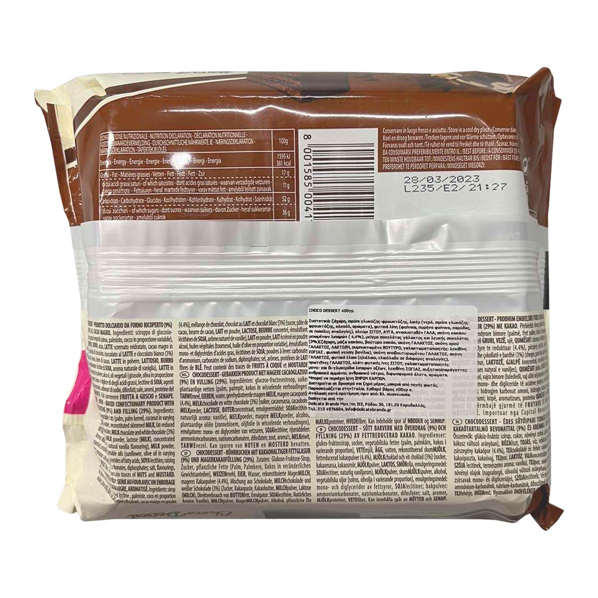 Ζάχαρη, σιρόπι γλυκόζης-φρουκτόζης, λικέρ (νερό, σιρόπι γλυκόζης-φρουκτόζης, αλκοόλ, αρώματα), φυτικά λίπη (φοίνικα, καρύδας σε ποικίλες αναλογίες), αλέυρι ΣΙΤΟΥ, ΑΥΓΑ, ανασυσταθέν ΓΑΛΑ, σκόνη κακάου μειωμένων λιπαρών (4,4%), μείγμα σοκολάτας γάλακτος και λευκής σοκολάτας (3%) ζάχαρη, μάζα κακάου, βούτυρου κακάο, σκόνη γάλακτος, σκόνη ορού ΓΑΛΑΚΤΟΣ, ΛΑΚΤΟΖΗ, συμπυκνωμένο ΒΟΥΤΥΡΟ, γαλακτωματοποιητής: λεκιθίνη ΣΟΓΙΑΣ, φυσική γεύση: βανίλια, σκόνη αποβουτυρωμένου ΓΑΛΑΚΤΟΣ, σκόνη ΓΑΛΑΚΤΟΣ, φυτικά έλαια (ηλιέλαιο, ελαιόλαδο σε διάφορες αναλογίες), πρωτεΐνες ΓΑΛΑΚΤΟΣ, αλάτι φυτικές ίνες ΣΙΤΟΥ, γαλακτωματοποιητές: μονό και δι-γλυκερίδια λιπαρών οξέων, λεκιθίνη ΣΟΓΙΑΣ, αυξητικοί παράγοντες ανθρακικό αμμώνιο, ανθρακικό νάτριο, διφωσφορικά άλατα, αρώματα.