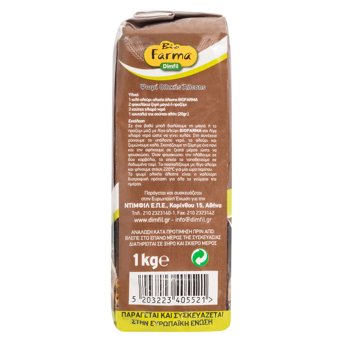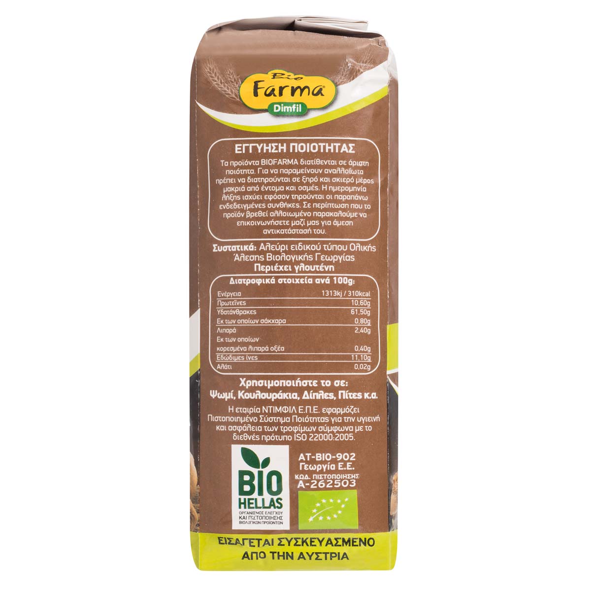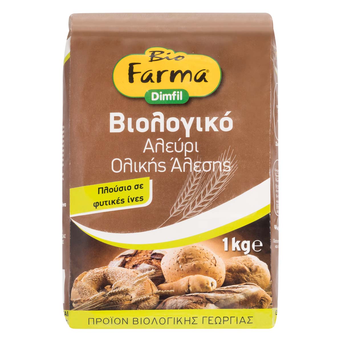 Το βιολογικό αλεύρι Bio Farma ολικής άλεσης παράγεται από προσεκτικά επιλεγμένες ποικιλίες σιταριών. Είναι πλούσιο σε φυτικές ίνες και είναι ιδανικό για την παρασκευή ψωμιού και άλλων αρτοσυσκευασμάτων.