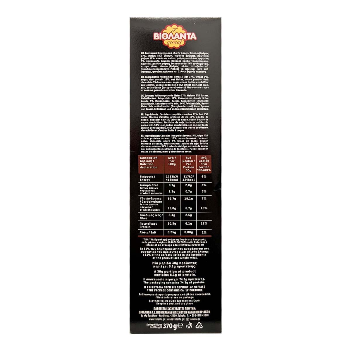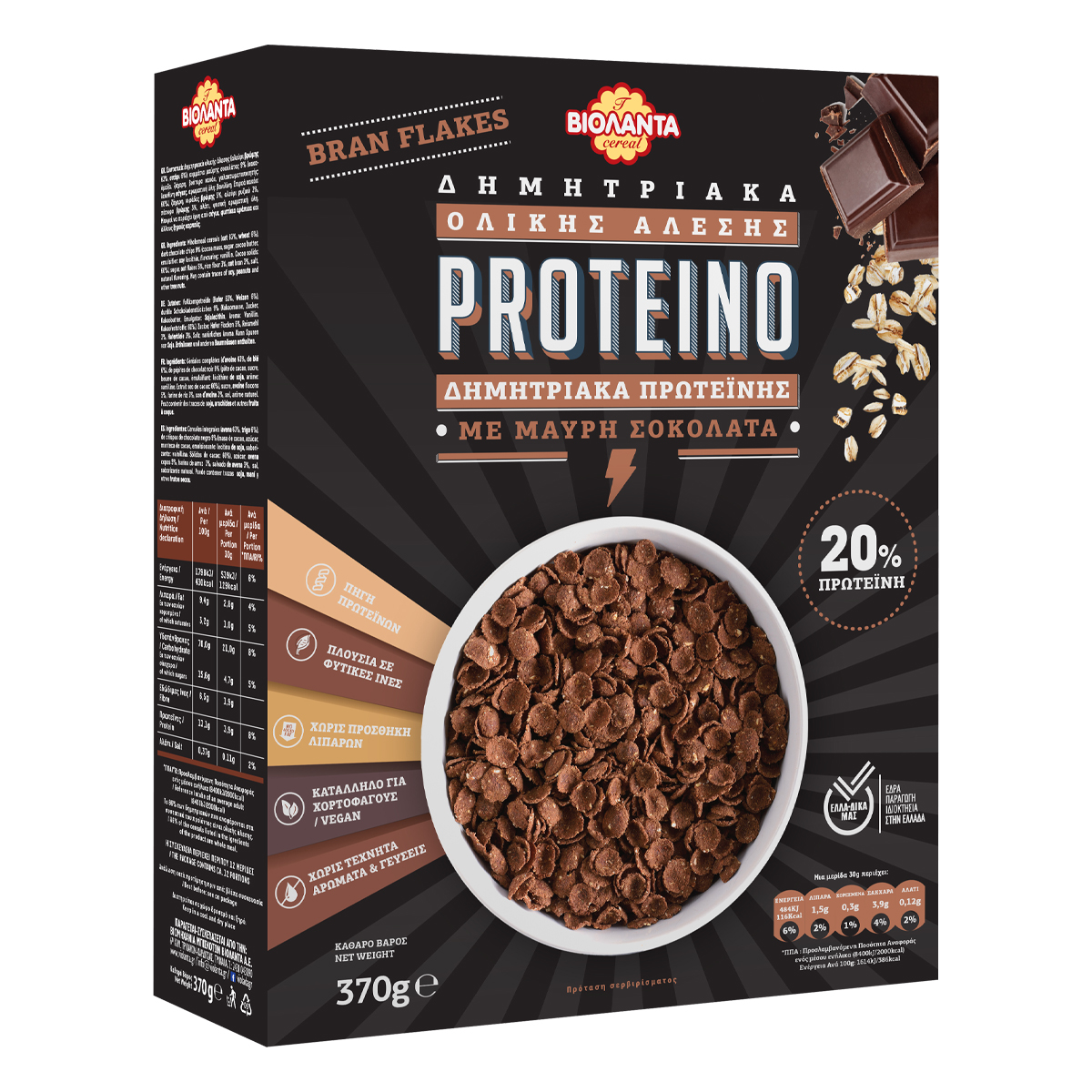 Βιολάντα Δημητριακά Proteino Με Μαύρη Σοκολάτα Vegan 370 gr