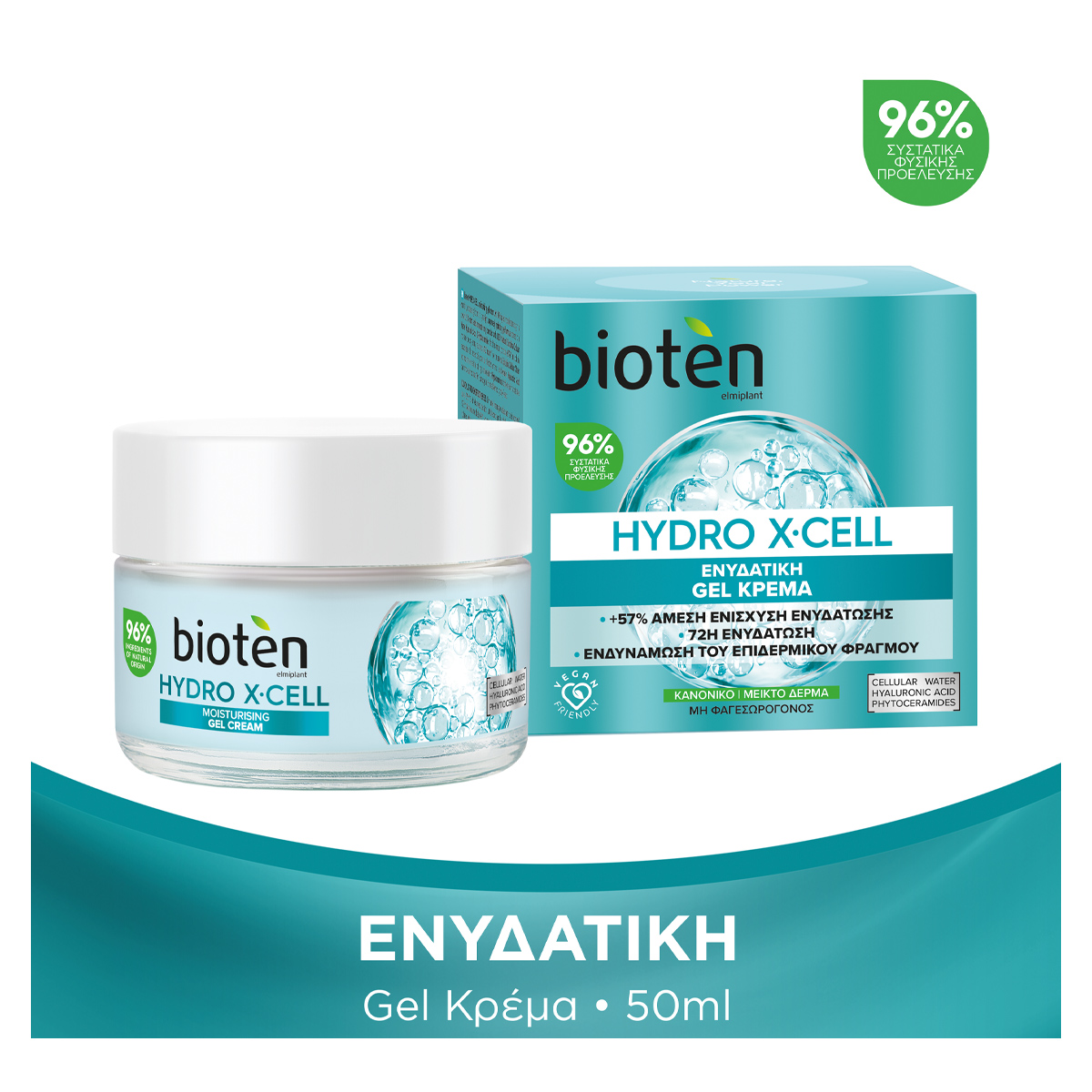 Η ενυδατική gel κρέμα bioten HYDRO X-CELL, με 96% συστατικά φυσικής προέλευσης, είναι η καθημερινή δόση εντατικής ενυδάτωσης για το δέρμα σας! Η ελαφριά, εξαιρετικά ενυδατική gel φόρμουλα περιέχει 5% από ένα ισχυρό, πολλαπλής δράσης ενυδατικό σύμπλοκο με 100% φυσικό Cellular Water από Σπιρουλίνα, Υαλουρονικό Οξύ & φυτικά Ceramides που προσφέρει άμεση ενυδάτωση +57%* και κλειδώνει την υγρασία έως και 72 ώρες*. Το πλούσιο σε θρεπτικά συστατικά Spirulina Cellular Water με τη δύναμη του superfood ενισχύει αποτελεσματικά την ενυδάτωση της επιδερμίδας. Το Υαλουρονικό Οξύ βελτιώνει την ελαστικότητα καθώς βοηθά το δέρμα να γεμίσει με ενυδάτωση. Τα φυτικά Ceramides ενισχύουν τoν επιδερμικό φραγμό ώστε να διατηρείται η υγρασία στο δέρμα. Μη φαγεσωρογόνος σύνθεση. ΚΛΙΝΙΚΑ ΑΠΟΔΕΔΕΙΓΜΕΝΗ ΑΠΟΤΕΛΕΣΜΑΤΙΚΟΤΗΤΑ.