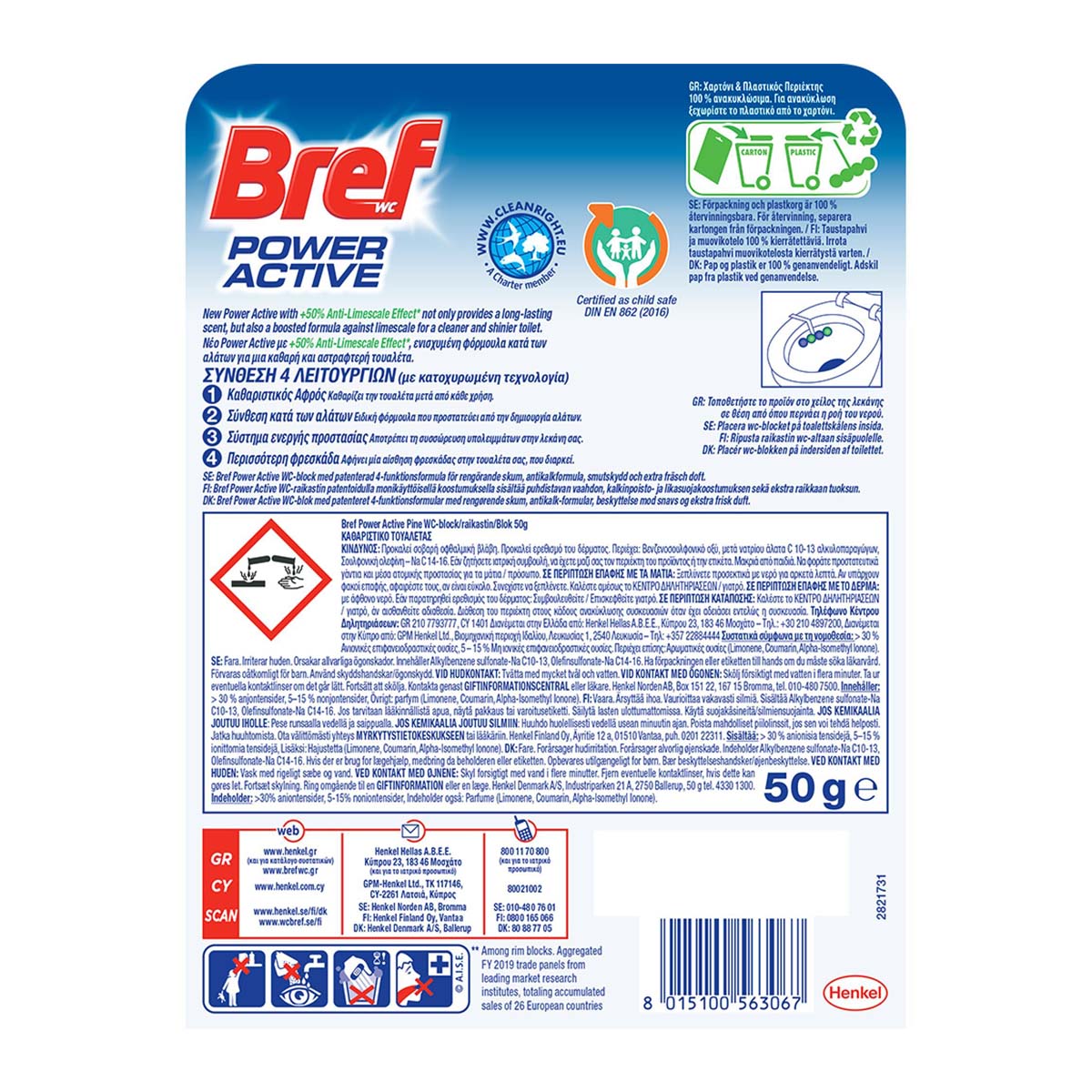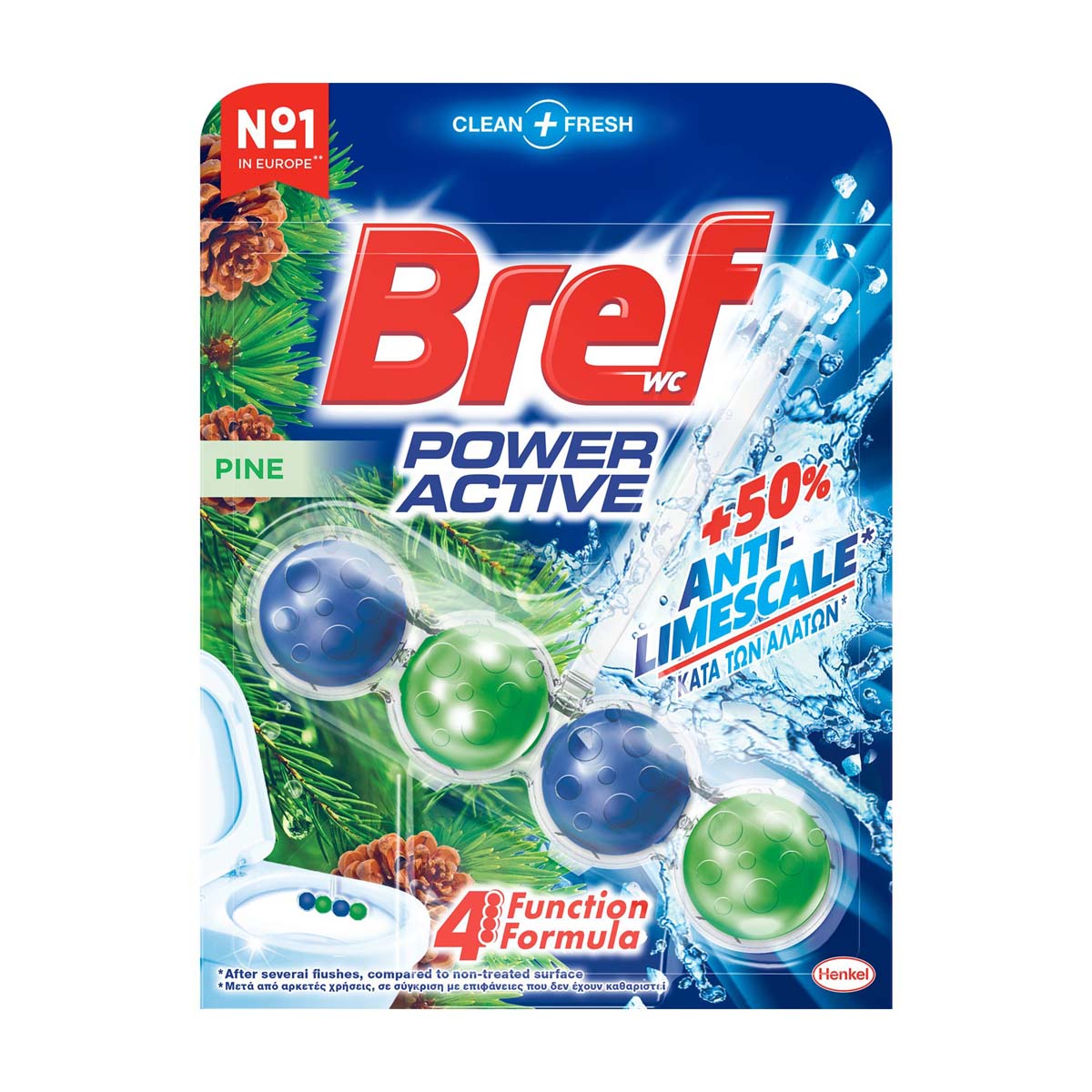 Νέο Power Active με +50% Anti-Limescale Effect, ενισχύμενη φόρμουλα κατά των αλάτων για μια καθαρή και αστραφτερή τουαλέτα! Η μοναδική του σύνθεση 4 λειτουργειών, αποτρέπει τον σχηματισμό αλάτων, απελευθερώνει καθαριστικό αφρό, παρέχει ένα σύστημα ενεργής προστασίας, αποτρέποντας την συσσώρευση υπολειμμάτων και προσφέρει φρεσκάδα που διαρκεί! Απλά τοποθετήστε το προϊόν στο χείλος της λεκάνης, προσαρμόστε το σύμφωνα με τη ροή του νερού και απολαύστε μέγιστη καθαριότητα και φρεσκάδα σε κάθε χρήση!