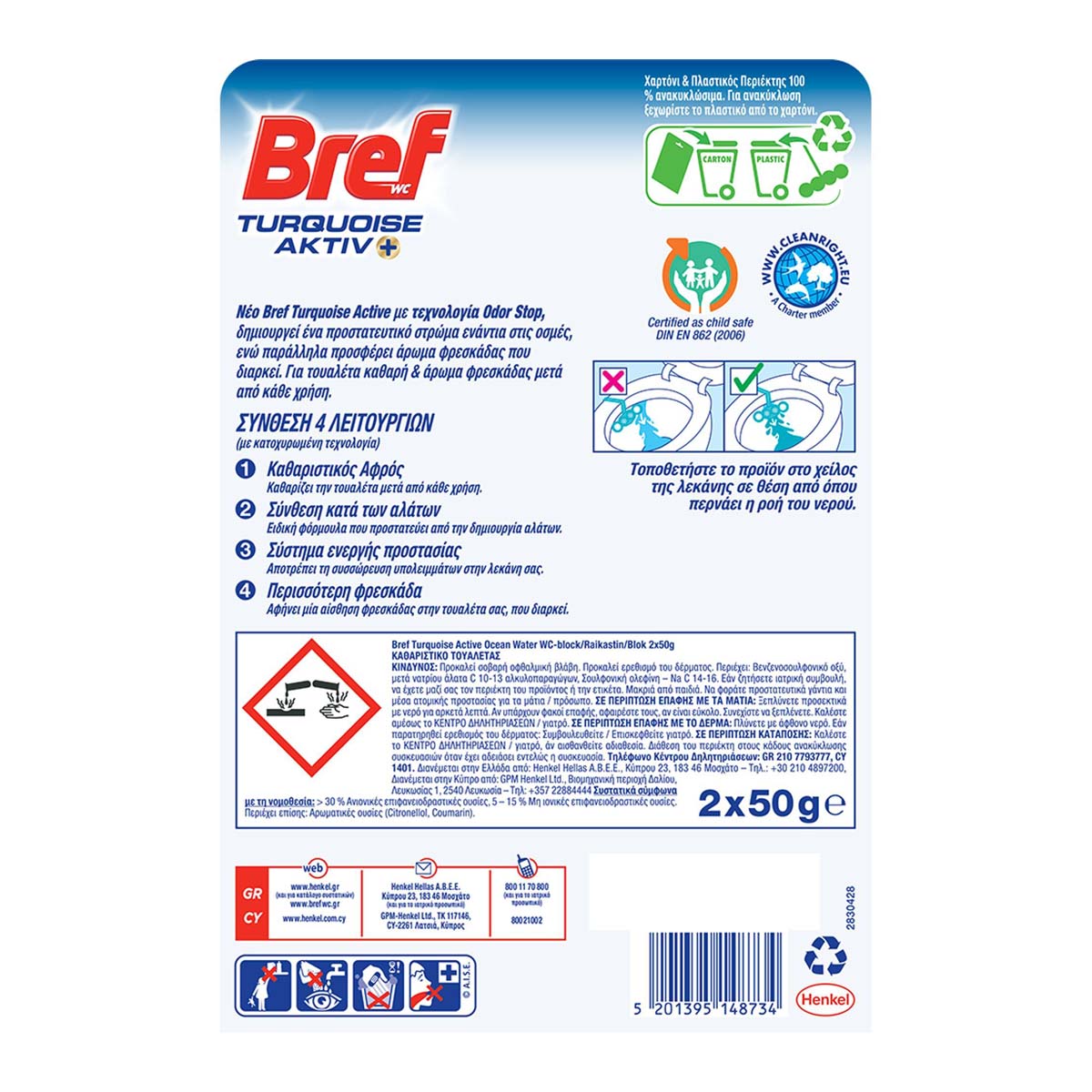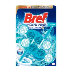 Συνδυασμός της τεχνολογίας του Turquoise Activ με το άρωμα ωκεανού για μέγιστη καθαριότητα και φρεσκάδα κάθε στιγμή! Χάρη στις ενισχυμένες τιρκουάζ μπάλες του με ενεργά συστατικά, το Bref Turquoise Activ διατηρεί την τουαλέτα σας καθαρή και γεμάτη φρεσκάδα ακόμα και όταν δεν την χρησιμοποιείτε. Πώς; Μόλις πατήσετε το καζανάκι, η θήκη του Turquoise Activ συγκεντρώνει το νερό, το εμπλουτίζει με τα ενεργά συστατικά του και το απελευθερώνει. Το τιρκουάζ νερό παραμένει στη τουαλέτα σας και καθαρίζει μέχρι την επόμενη χρήση, ενώ ένα υπέροχο άρωμα ωκεανού δίνει μια αίσθηση φρεσκάδας καθ' όλη την διάρκεια χρήσης του προϊόντος! Επιπλέον, εμπλουτισμένο με την επιτυχημένη φόρμουλα 4 λειτουργιών των Power Active, το Bref Turquoise Activ αποτρέπει τον σχηματισμό αλάτων, απελευθερώνει καθαριστικό αφρό, παρέχει ένα σύστημα ενεργής προστασίας, αποτρέποντας την συσσώρευση υπολειμμάτων και προσφέρει περισσότερη φρεσκάδα.