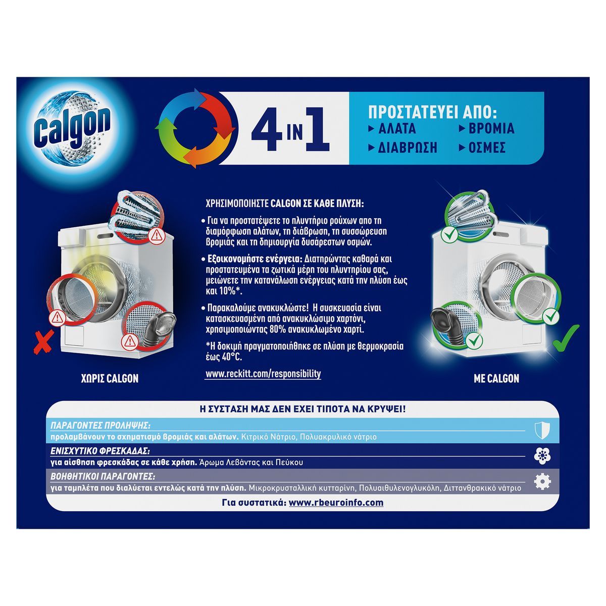 Calgon αποσκληρυντικό νερού πλυντηρίου ρούχων. Για ένα προστατευμένο, καθαρό και με περισσότερη φρεσκάδα πλυντήριο, το Calgon έχει 3 εξουδετερωτικές δράσεις: Ισχυρή προστασία από τα άλατα που συμβάλλει στην πρόληψη των βλαβών του πλυντηρίου, Με δράση κατά της βρομιάς, που συμβάλλει στην προσπασία απο τη συσσώρευση της βρομιάς και των καταλοίπων του απορρυπαντικού, Συμβάλλει στην πρόληψη των δυσάρεστων οσμών που σχηματίζονται στο πλυντήριο.