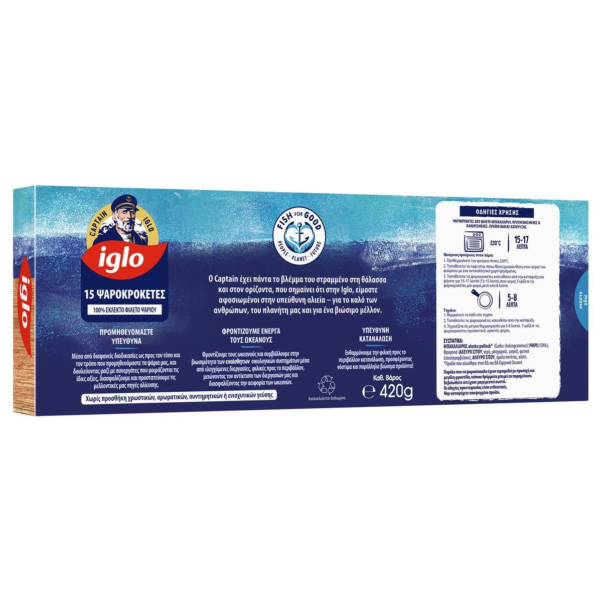 Ψαροκροκέτες από 100% φιλέτο μπακαλιάρου σε τραγανιστό πανάρισμα. Αποτελεί πηγή Ω-3 λιπαρων οξέων χωρίς προσθήκη συντηρητικών, ενισχυτικών γεύσης, χρωστικών & αρωματικών σε ανακυκλώσιμη συσκευασία.