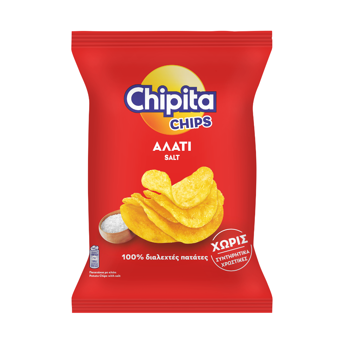 Γευστικά και τραγανά, σκέτα ή με ντίπ, απολαύστε τα Chipita Chips. Κάθε πατατάκι φτιάχνεται από 100% διαλεχτές πατάτες. Ιδανικά για κινηματογραφικές βραδιές, πάρτι, εκδρομές, ή απλά για ένα γρήγορο και νόστιμο σνακ.
