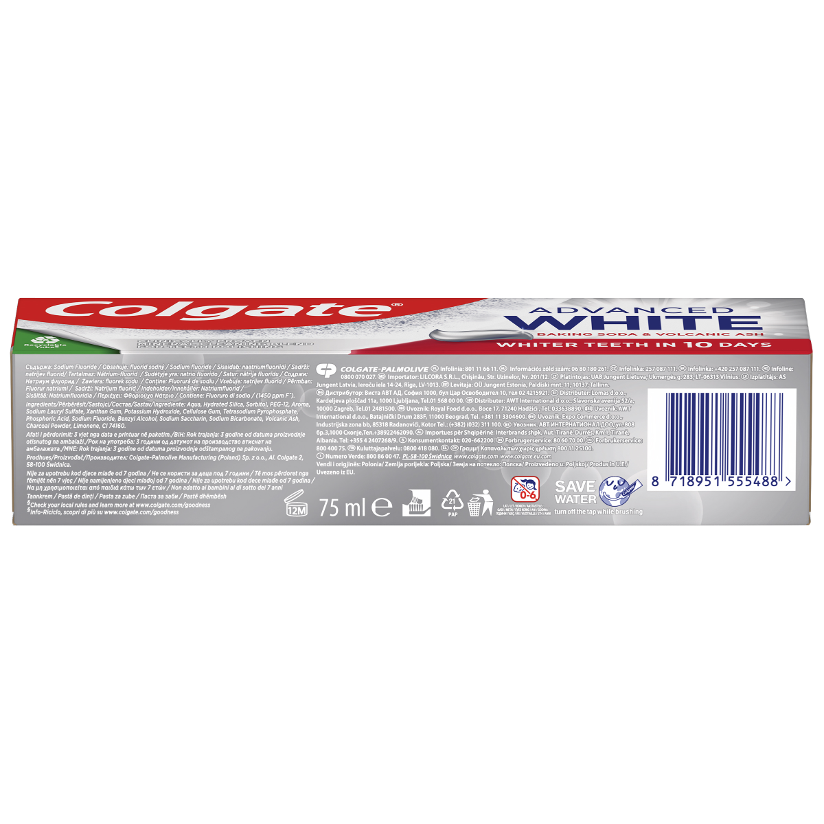 Η οδοντόκρεμα Colgate Advanced White Baking Soda & Volcanic Ash είναι κλινικά αποδεδειγμένο ότι αφαιρεί τους επιφανειακούς λεκέδες για λευκότερα δόντια σε 10 ημέρες. Η οδοντόκρεμα λεύκανσης καταπολεμά την τερηδόνα & βοηθά στην απομάκρυνση της πλάκας.