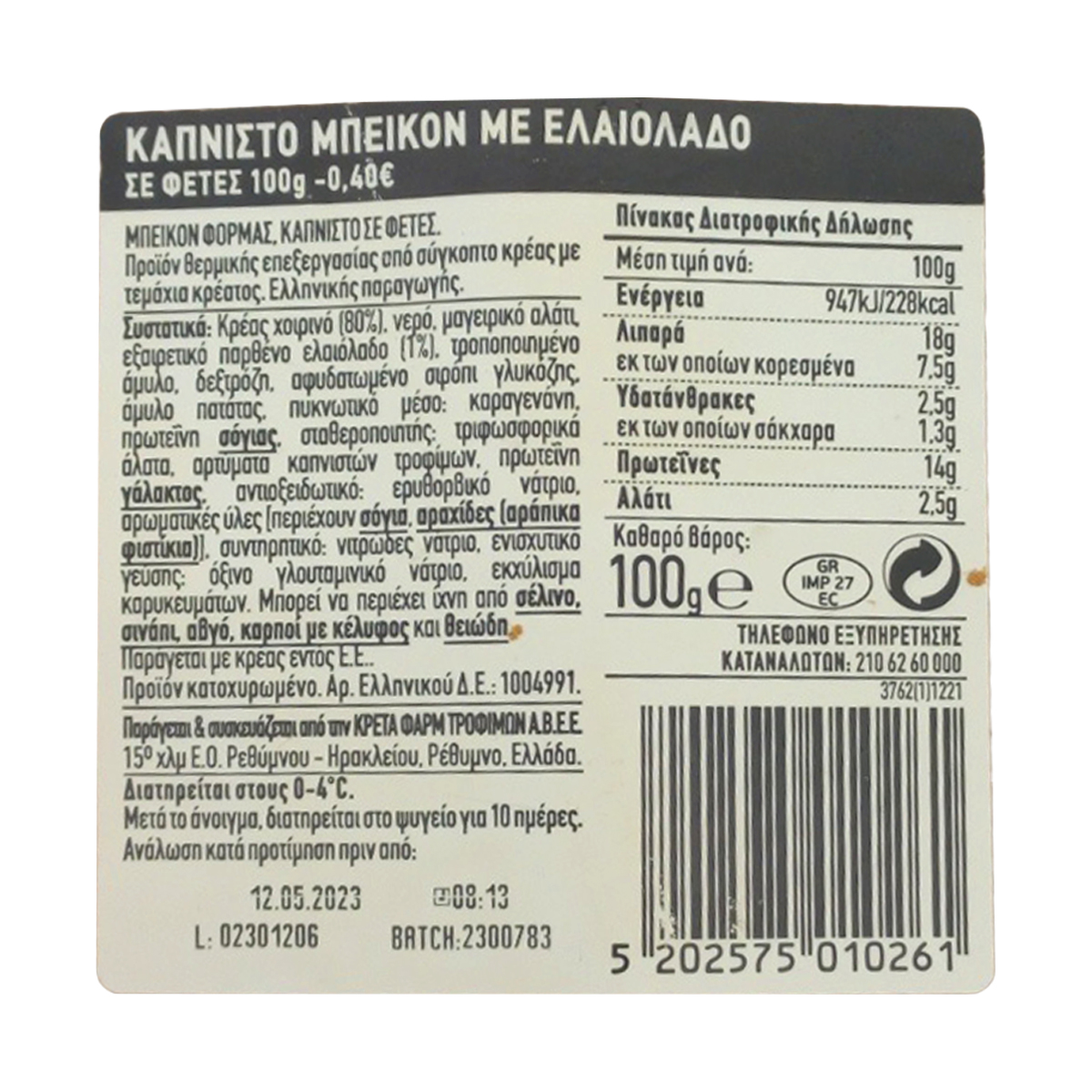 Από εκλεκτό χοιρινό κρέας και ελαιόλαδο. Διπλά απολαυστικό και τρυφερό, λόγω του ελαιόλαδου. Μοναδική και πλούσια καπνιστή γεύση. Ιδανικό για την ομελέτα, την πίτσα ή την μακαρονάδα σας. Χωρίς γλουτένη.