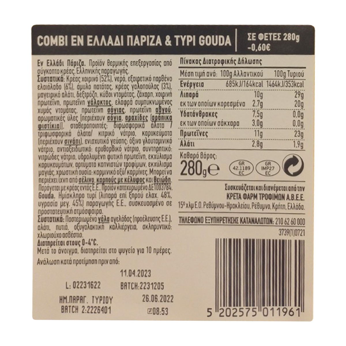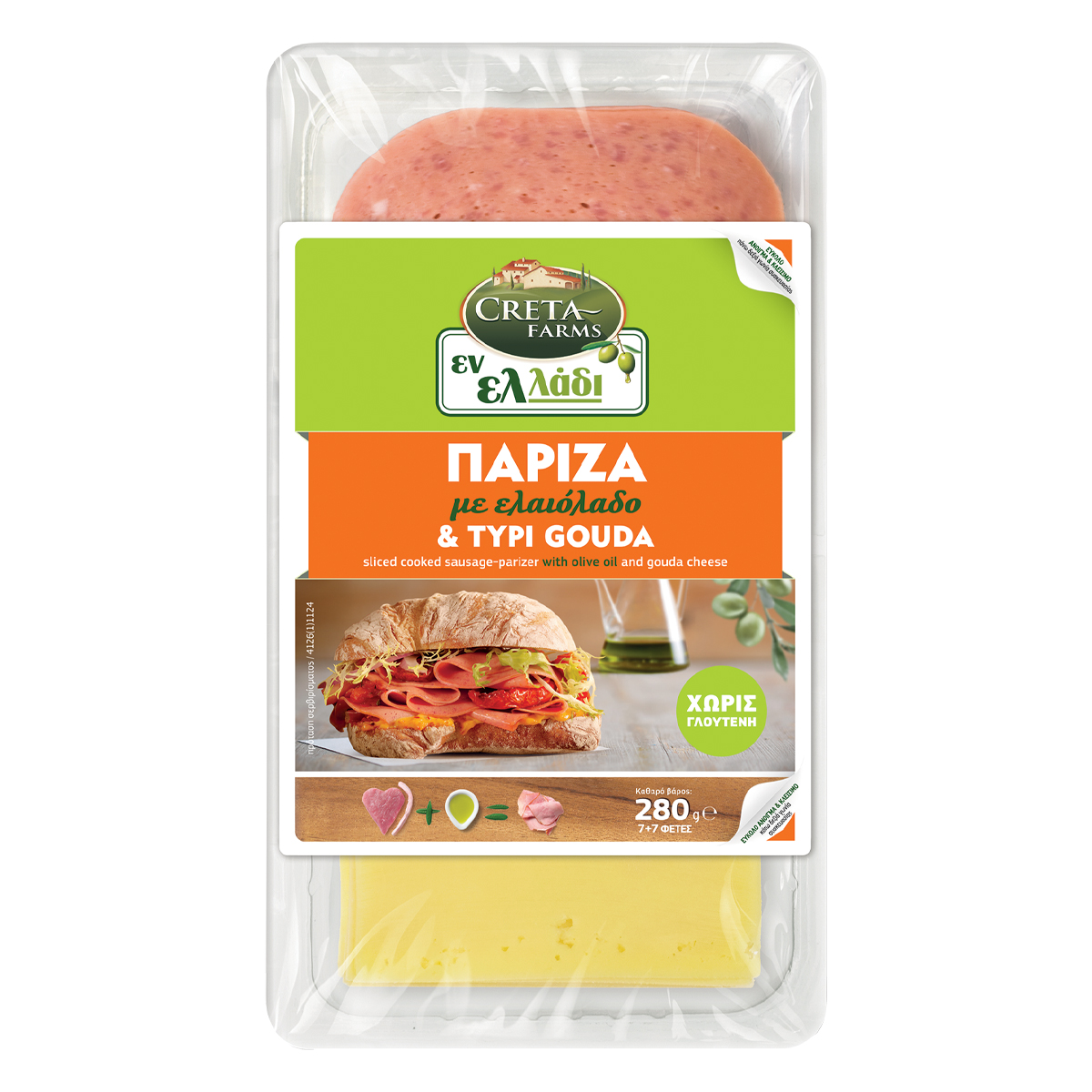 Πάριζα με εξαιρετικό παρθένο ελαιόλαδο και τυρί Gouda εκλεκτής ποιότητας, σε φέτες, σε μια πρακτική διπλή συσκευασία. Χάρη στην πρωτοποριακή τεχνολογία της διπλής παστερίωσης, διατηρείται αναλλοίωτη η γεύση και τα θρεπτικά συστατικά του αλλαντικού με φυσικό τρόπο.
