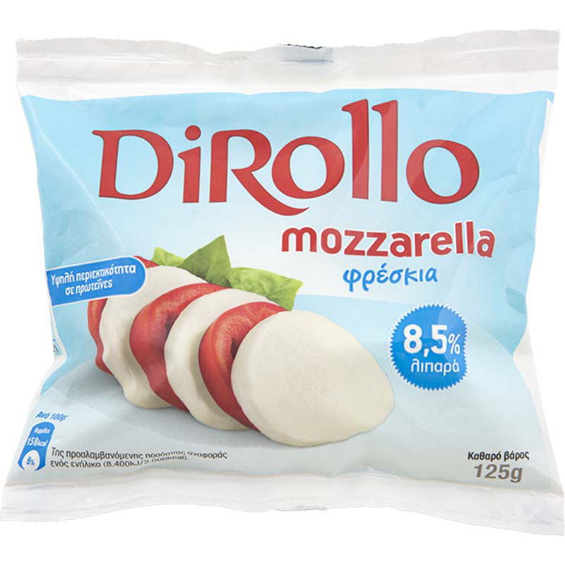 Η Dirollo mozzarella είναι φρέσκια mozzarella σε μπαλάκι και έχει μόνο 8,5% λιπαρά.