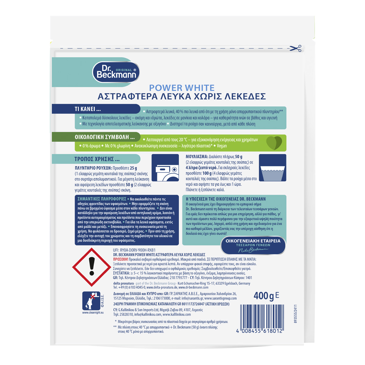 Το Ισχυρό Λευκαντικό Αφαιρετικό Λεκέδων είναι ένα εξαιρετικά αποτελεσματικό πρόσθετο σκόνης που ενισχύει την αποτελεσματικότητα οποιουδήποτε απορρυπαντικού. Η ισχυρή του σύνθεση χωρίς χλωρίνη λευκαίνει τα λευκά έως και 40% περισσότερο από τη χρήση μόνο απορρυπαντικού, χωρίς να καταστρέφει τα ρούχα. Επιπλέον, είναι αποτελεσματικό για 100 διαφορετικούς τύπους λεκέδων, παρέχοντας βαθύ καθαρισμό και υγιεινή. Το πρόσθετο σκόνης μπορεί να χρησιμοποιηθεί ακόμη και σε χαμηλές θερμοκρασίες, όπως 20 °C, συμβάλλοντας στην εξοικονόμηση ενέργειας και πόρων. Επίσης, δεν περιέχει αρώματα και χλωριούχο χλωρίνη.