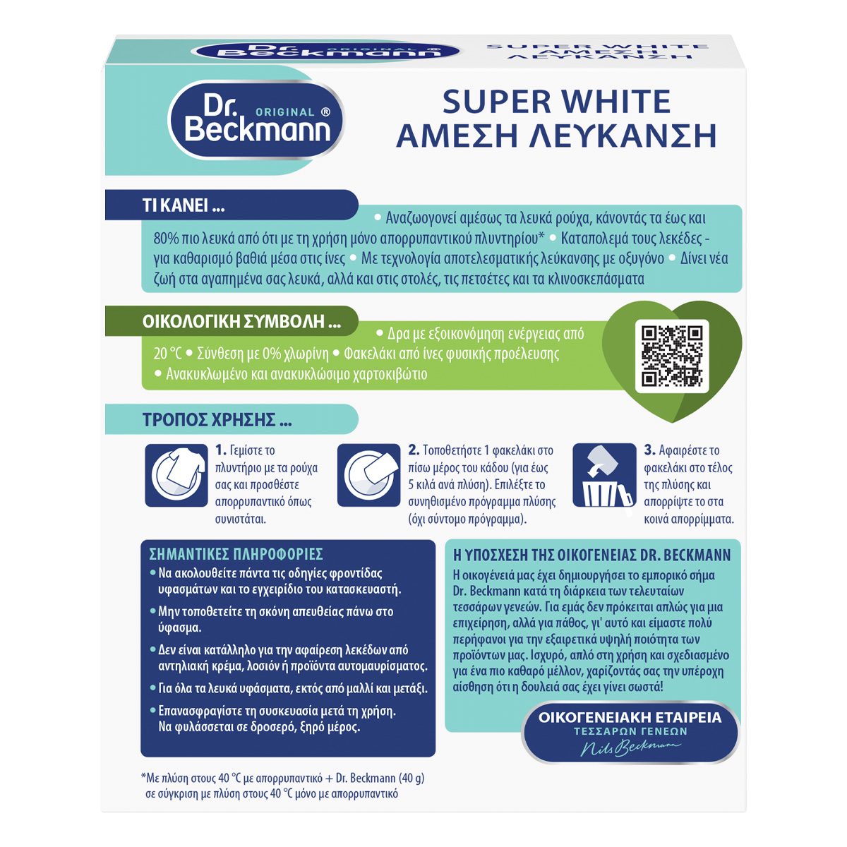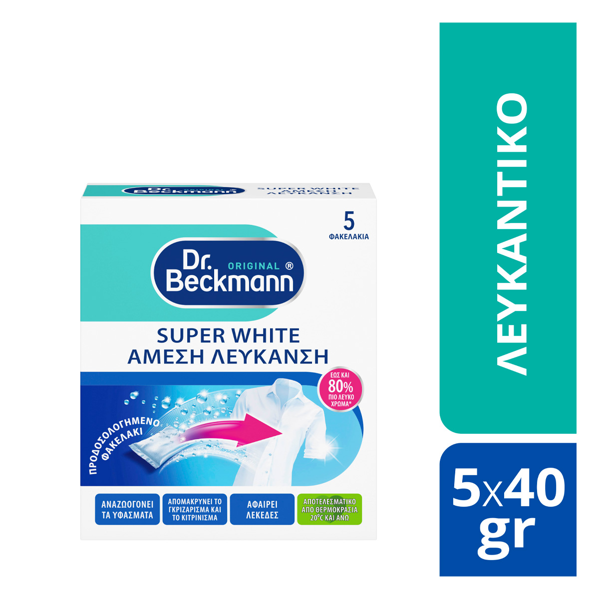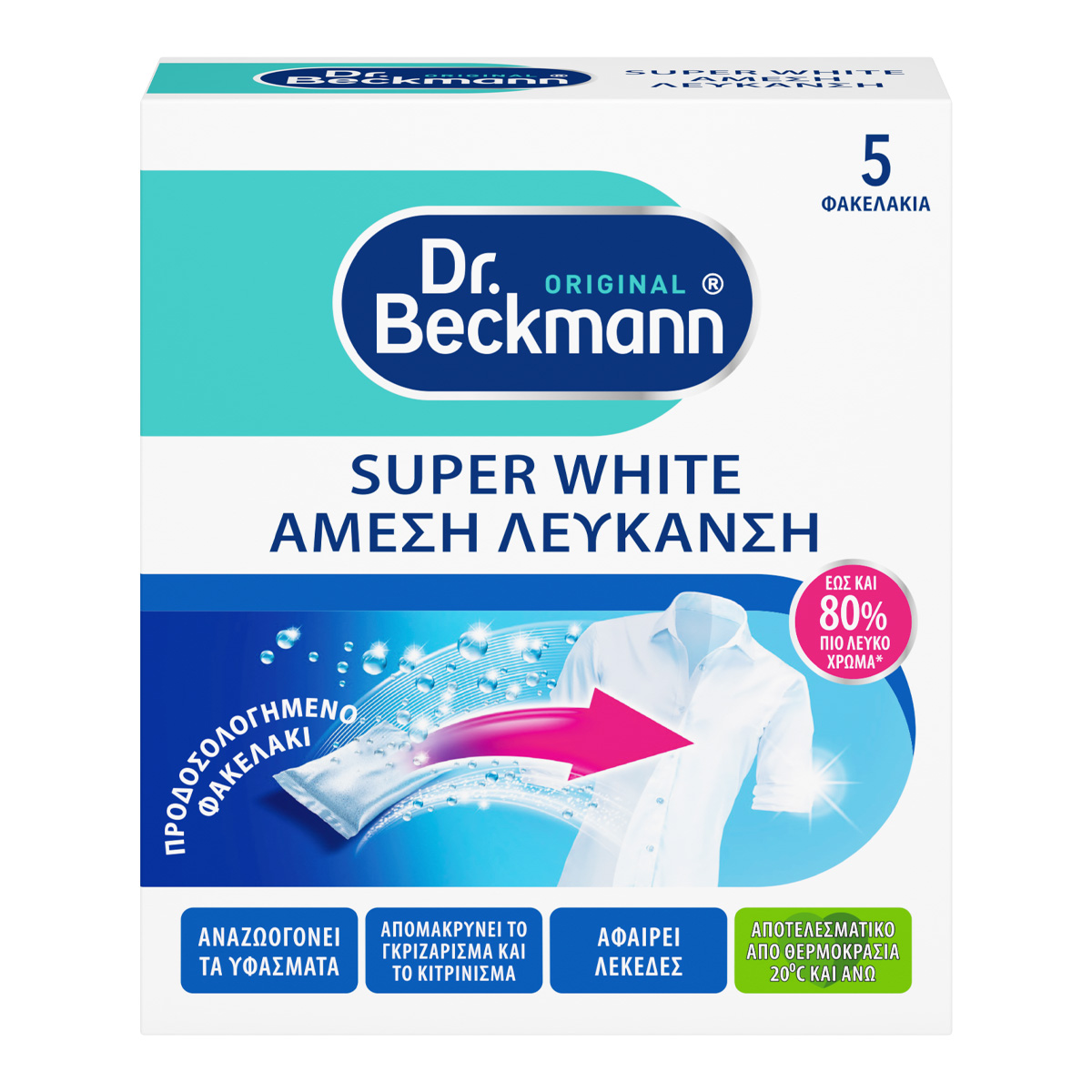 Το λευκαντικό Dr. Beckmann Super White κάνει τα λευκά σας ακόμα πιο αστραφτερά, ενώ η ισχυρή του σύνθεση λευκαίνει τα λευκά έως και 80% περισσότερο. Απομακρύνει το κιτρίνισμα και το γκριζάρισμα, ενώ αφαιρεί και τους λεκέδες. Διατηρήστε τα λευκά υφάσματα κατάλευκα σε κάθε πλύση!