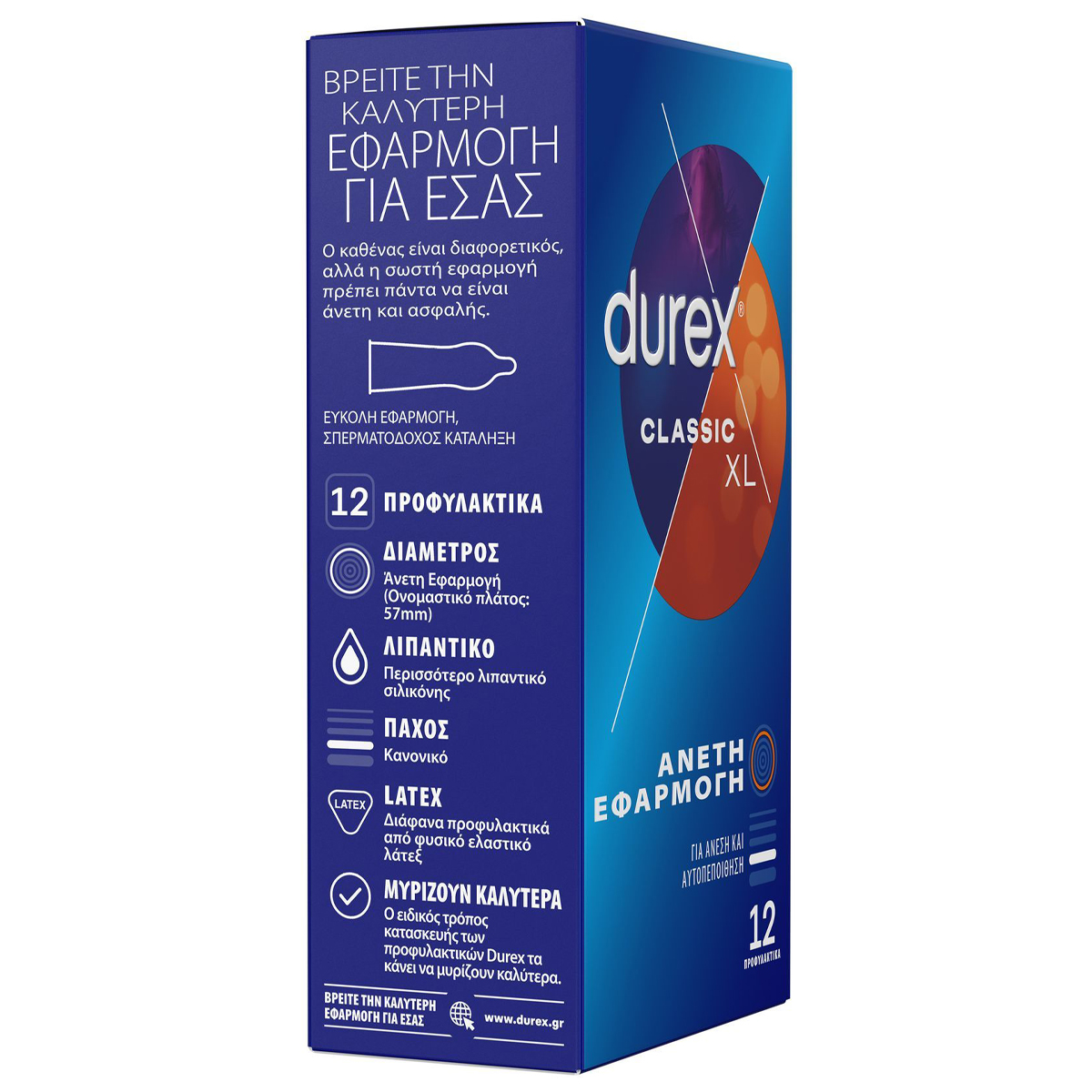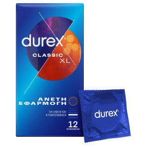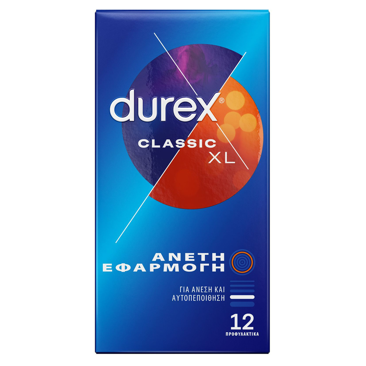 Τα προφυλακτικά Durex Classic XL Άνετη εφαρμοργή κατασκευάστηκαν γιατί κανείς δεν αισθάνεται άνετα φορώντας πράγματα που είναι πολύ στενά. Μια άνετη εφαρμογή είναι ιδιαίτερα σημαντική όταν πρόκειται για προφυλακτικά - στην πραγματικότητα, η εύρεση του προφυλακτικού που σας ταιριάζει μπορεί να έχει μεγάλο αντίκτυπο στην ευχαρίστηση και την ηρεμία σας. Οπότε αν χρειάζεστε μεγαλύτερο μέγεθος από το συνηθισμένο των προφυλακτικών μας, μπορείτε ακόμα να χαλαρώσετε και να απολαύσετε το σεξ χωρίς να χρειάζεται να ανησυχείτε για ο, τιδήποτε θα μπορούσε να χαλάσει το στυλ σας. Ποιότητα Durex: 100% ηλεκτρονικά ελεγμένα με 5 επιπλέον ελέγχους ποιότητας που διεξάγονται σε κάθε παρτίδα. Επίσης είναι δερματολογικά ελεγμένα. Θυμηθείτε ότι καμία μέθοδος αντισύλληψης δεν προσφέρει 100% προστασία έναντι της εγκυμοσύνης, του ιού HIV ή άλλων σεξουαλικά μεταδιδόμενων ασθενειών. Καλό είναι να είστε ενημερωμένοι, γι’ αυτό διαβάστε τις πληροφορίες που εσωκλείονται, ειδικά αν χρησιμοποιείτε προφυλακτικά για πρωκτικό ή στοματικό σεξ.