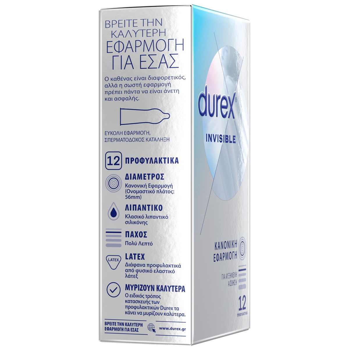 Τα προφυλακτικά Durex Invisible έχουν σχεδιαστεί για να μεγιστοποιούν την αίσθηση, παρέχοντας παράλληλα υψηλό επίπεδο ασφάλειας και προστασίας Είναι 100% ηλεκτρονικά ελεγμένα με 5 επιπλέον ελέγχους ποιότητας που διεξάγονται σε κάθε παρτίδα. Επίσης είναι δερματολογικά ελεγμένα. Διάμετρος Regular (oνομαστικό πλάτος: 56mm). Θυμηθείτε ότι καμία μέθοδος αντισύλληψης δεν προσφέρει 100% προστασία έναντι της εγκυμοσύνης, του ιού HIV ή άλλων σεξουαλικά μεταδιδόμενων ασθενειών. Καλό είναι να είστε ενημερωμένοι, γι’ αυτό διαβάστε τις πληροφορίες που εσωκλείονται, ειδικά αν χρησιμοποιείτε προφυλακτικά για πρωκτικό ή στοματικό σεξ.