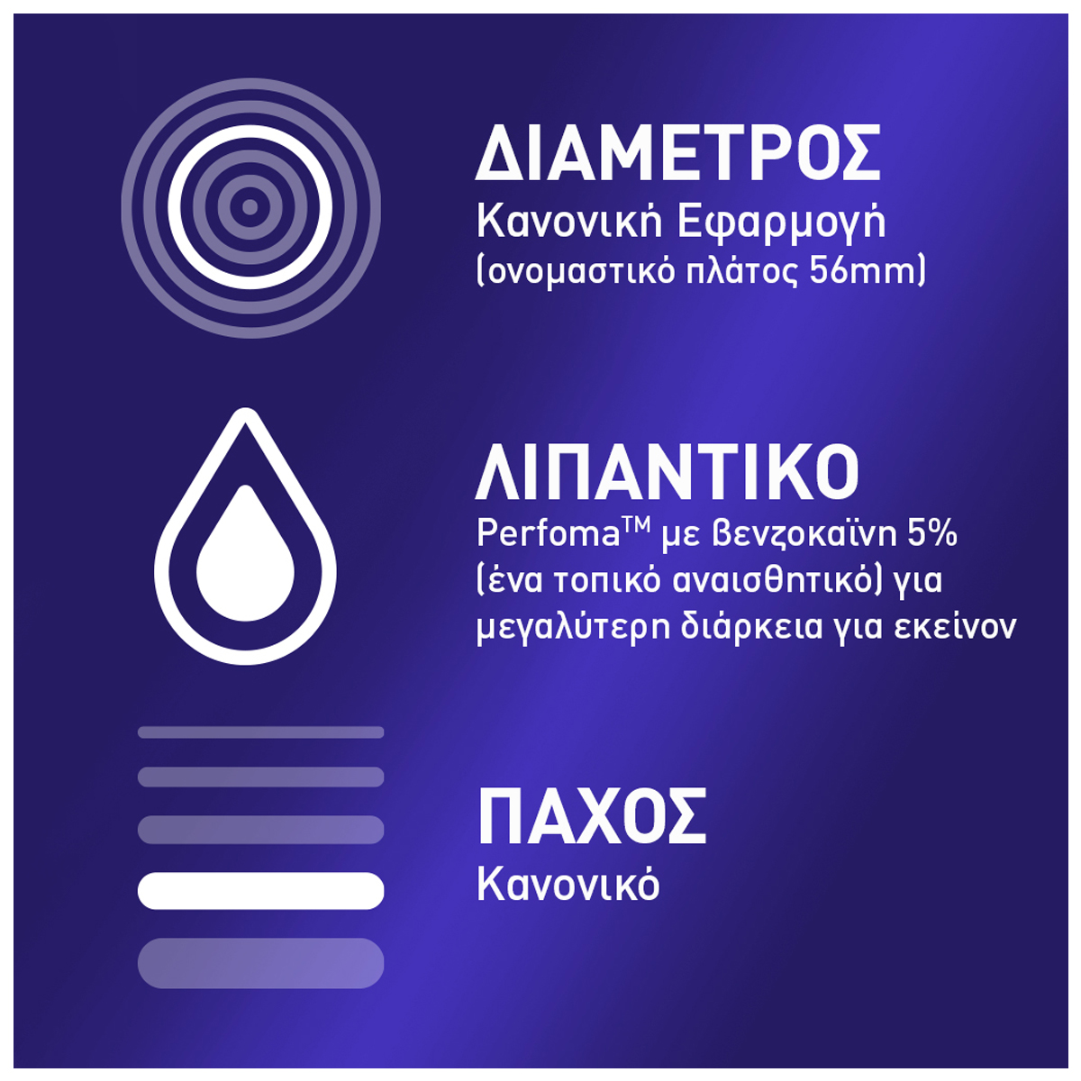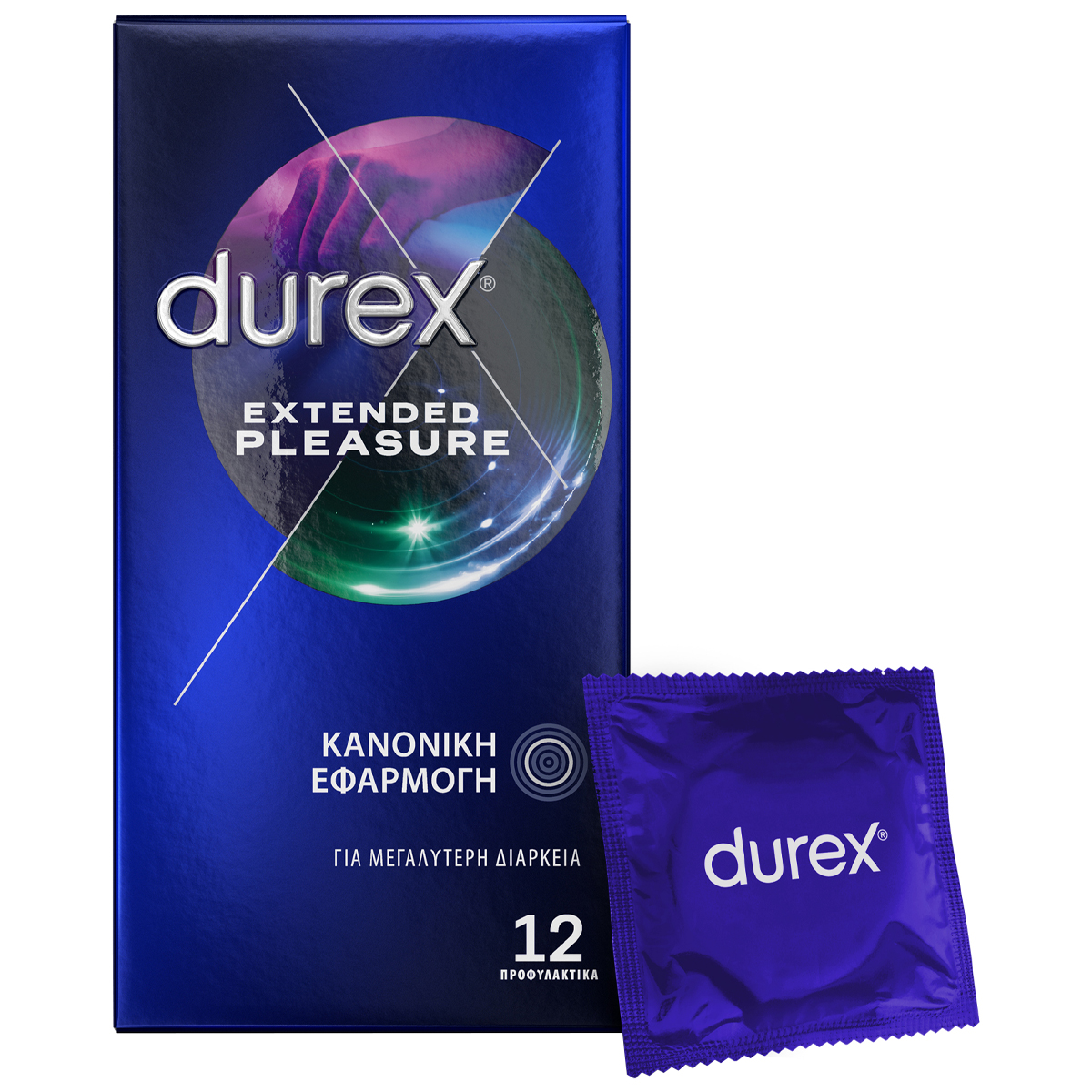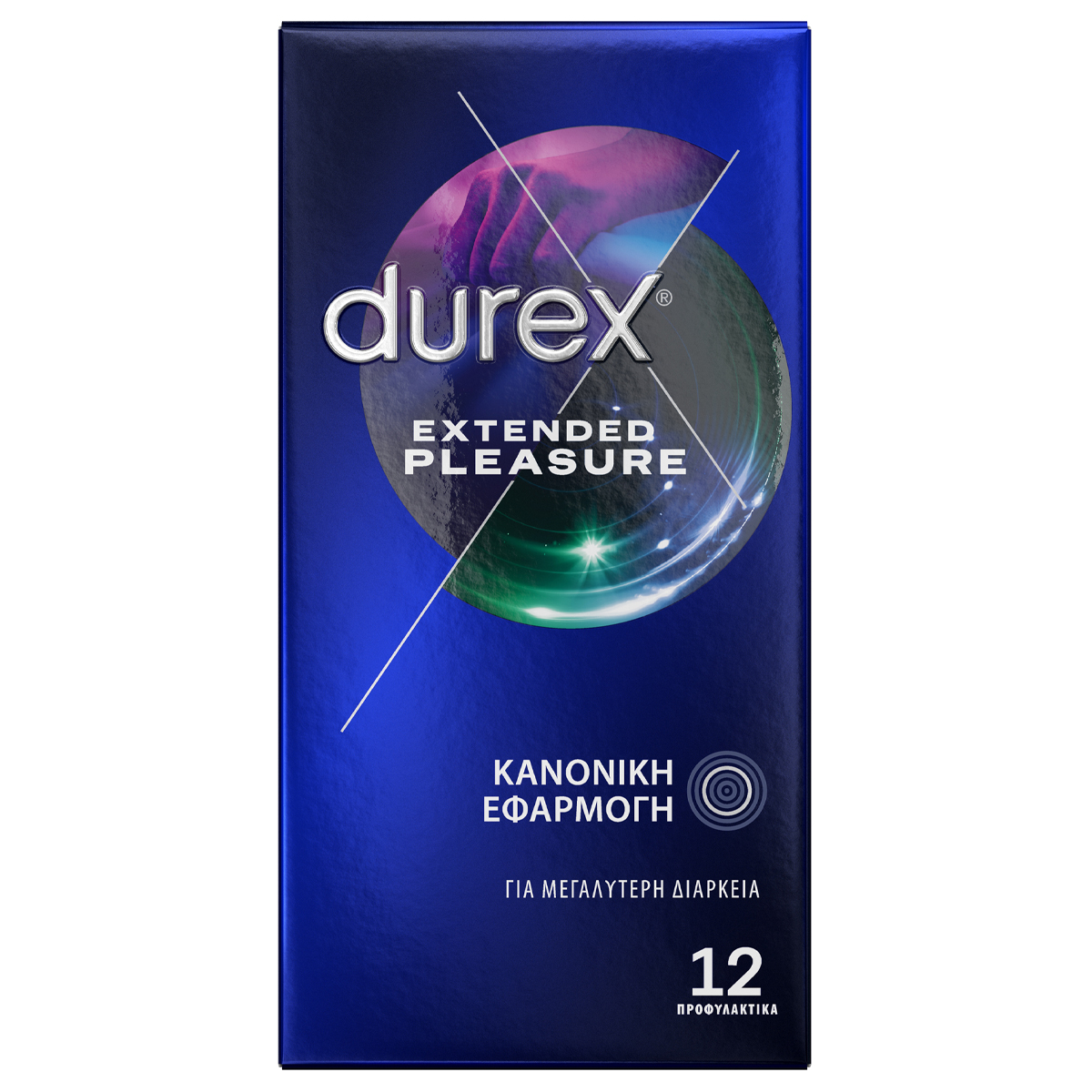 Τα προφυλακτικά Durex Extended Pleasure είναι εμποτισμένα με λιπαντικό Performa™ για να επιβραδύνουν τον οργασμό του άντρα, διατηρώντας τη διέγερσή του και κάνοντας το σεξ να διαρκεί περισσότερο. Είναι 100% ηλεκτρονικά ελεγμένα με 5 επιπλέον ελέγχους ποιότητας που διεξάγονται σε κάθε παρτίδα. Επίσης είναι δερματολογικά ελεγμένα. Κανονική εφαρμογή (oνομαστικό πλάτος: 56mm). Θυμηθείτε ότι καμία μέθοδος αντισύλληψης δεν προσφέρει 100% προστασία έναντι της εγκυμοσύνης, του ιού HIV ή άλλων σεξουαλικά μεταδιδόμενων ασθενειών. Καλό είναι να είστε ενημερωμένοι, γι’ αυτό διαβάστε τις πληροφορίες που εσωκλείονται, ειδικά αν χρησιμοποιείτε προφυλακτικά για πρωκτικό ή στοματικό σεξ.