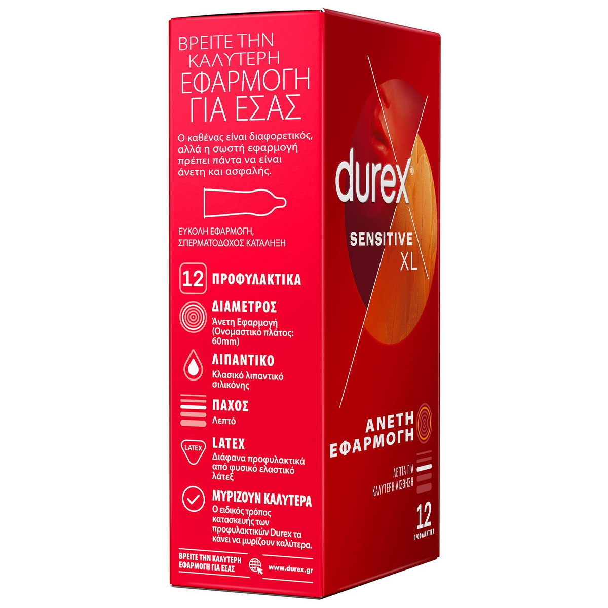 Τα λεπτά προφυλακτικά Durex Sensitive XL είναι κατάλληλα για όσους θέλουν ακόμη πιο άνετη εφαρμογή από τα Durex Sensitive κανονική εφαρμογή. Τα συγκεκριμένα προφυλακτικά προσφέρουν μεγαλύτερη ευαισθησία, αυξάνοντας την αίσθηση της επαφής με τον/την σύντροφό σας χωρίς να θυσιάζετε την ασφάλειά σας και μυρίζουν καλύτερα. Είναι 100% ηλεκτρονικά ελεγμένα με 5 επιπλέον ελέγχους ποιότητας που διεξάγονται σε κάθε παρτίδα. Επίσης είναι δερματολογικά ελεγμένα. Μεγάλη διάμετρος Large (oνομαστικό πλάτος: 60mm). Θυμηθείτε ότι καμία μέθοδος αντισύλληψης δεν προσφέρει 100% προστασία έναντι της εγκυμοσύνης, του ιού HIV ή άλλων σεξουαλικά μεταδιδόμενων ασθενειών. Καλό είναι να είστε ενημερωμένοι, γι’ αυτό διαβάστε τις πληροφορίες που εσωκλείονται, ειδικά αν χρησιμοποιείτε προφυλακτικά για πρωκτικό ή στοματικό σεξ.