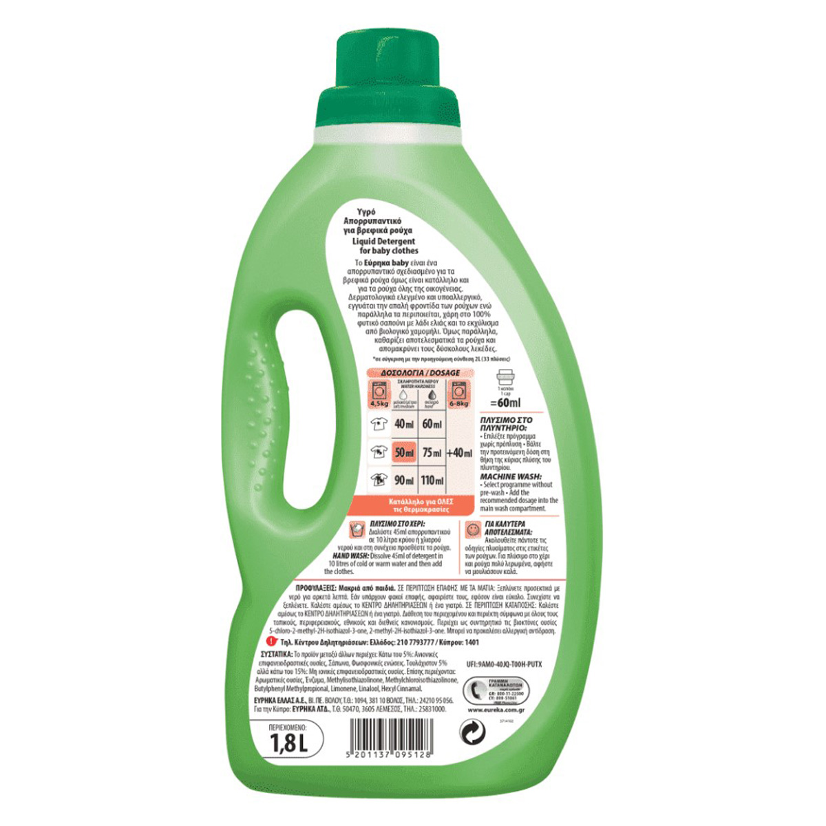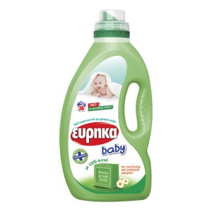 Υγρό απορρυπαντικό για βρεφικά ρούχα. Καθαρίζει σαν Εύρηκα, περιποιείται σαν χάδι. Το Εύρηκα baby είναι ένα απορρυπαντικό ειδικά σχεδιασμένο για τα βρεφικά ρούχα όμως είναι κατάλληλο και για τα ρούχα όλης της οικογένειας. Δερματολογικά ελεγμένο και υποαλλεργικό, εγγυάται την απαλή φροντίδα των ρούχων, ενώ παράλληλα τα περιποιείται χάρη στο 100% φυτικό σαπούνι με λάδι ελιάς και το εκχύλισμα από βιολογικό χαμομήλι. Όμως παράλληλα, καθαρίζει αποτελεσματικά τα ρούχα και απομακρύνει τους δύσκολους λεκέδες.