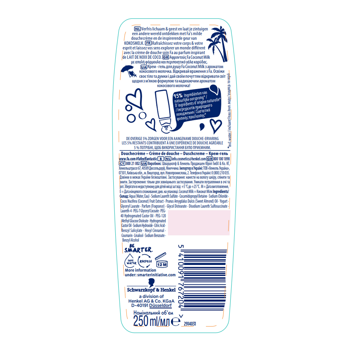 Τολμήστε να εξερευνήσετε το νέο Fa! Αναζωογονήστε το σώμα και το πνεύμα σας και αφήστε τις αισθήσεις σας να εξερευνήσουν έναν διαφορετικό κόσμο κάθε μέρα με το αφρόλουτρο Fa Coconut Milk με περιποιητικό άρωμα από γάλα καρύδας.