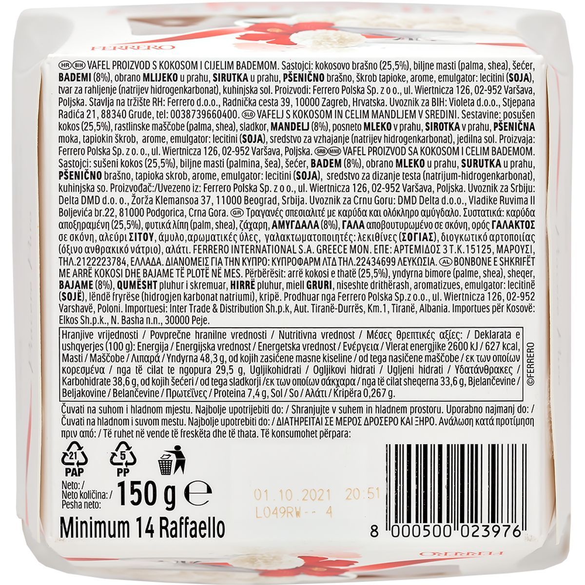 H συνταγή του Raffaello είναι μια αρμονία από προσεκτικά επιλεγμένα συστατικά: επιλεγμένη καρύδα από τα Νησιά του Ειρηνικού, λευκό αμύγδαλο από την Καλιφόρνια.Το Raffaello είναι μια εκλεπτυσμένη απόλαυση, μια μοναδική σπεσιαλιτέ της Ferrero.
