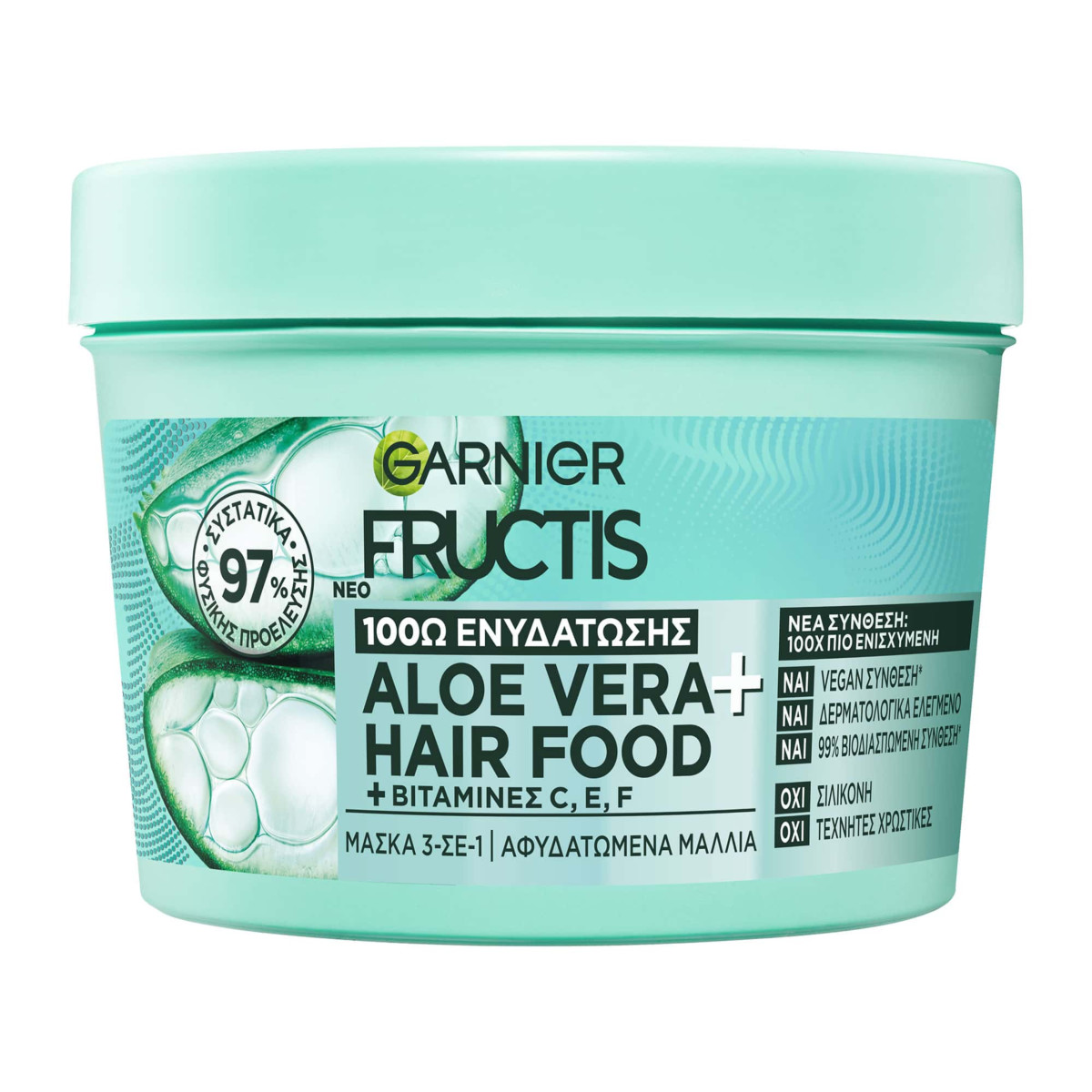 Η Νο1 μάσκα μαλλιών στην Ευρώπη με 97% συστατικά φυσικής προέλευσης επέστρεψε με νέα σύνθεση και εμφάνιση! Εμπλουτισμένη με Αλόη και βιταμίνες C, E, F η μάσκα πολλαπλών χρήσεων HAIRFOOD ALOE VERA υπόσχεται 8Χ περισσότερη ενυδάτωση απο τις ρίζες έως τις άκρες! Η ενισχυμένη σύνθεση της σε συνδυασμό με την πλούσια υφή της χαρίζει ανάλαφρη αίσθηση και επαναφέρει την ενυδάτωση της τρίχας. 3 διαφορετικοί τρόποι χρήσης: - Σαν conditioner, - Σαν μάσκα ή - Σαν κρέμα leave in χωρίς ξέβγαλμα σε βρεγμένα ή στεγνά μαλλιά. Αποτέλεσμα: 8x περισσότερη ενυδάτωση! Με vegan σύνθεση*. 97% συστατικά φυσικής προέλευσης. 99% Βιοδιασπώμενη σύνθεση. Δερματολογικά ελεγμένο. Εγκεκριμένο από τον Cruelty Free International *Χωρίς συστατικά ή παράγωγα ζωικής προέλευσης. Η Garnier είναι εγκεκριμένη από το Leaping Bunny Programme του Cruelty Free International.