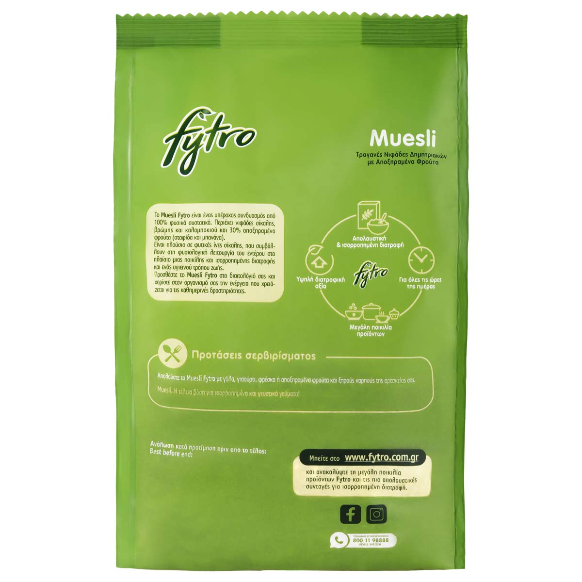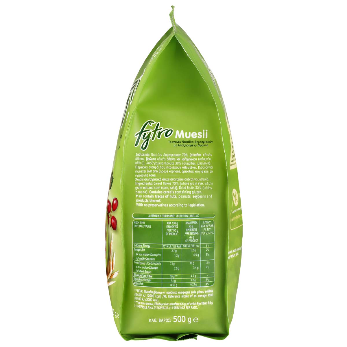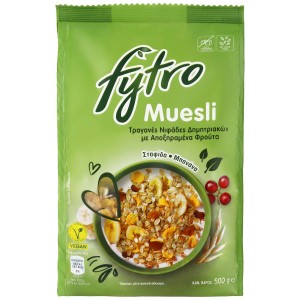 Το Muesli Fytro είναι ένας υπέροχος συνδυασμός από νιφάδες σίκαλης, βρώμης και καλαμποκιού και αποξηραμένα φρούτα (σταφίδα και μπανάνα). Το Muesli Fytro είναι πλούσιο σε φυτικές ίνες, που συμβάλλουν στη φυσιολογική λειτουργία του εντέρου μέσα στo πλαίσιo μiας ποικίλης και ισορροπημένης διατροφής και ενός υγιεινού τρόπου ζωής.