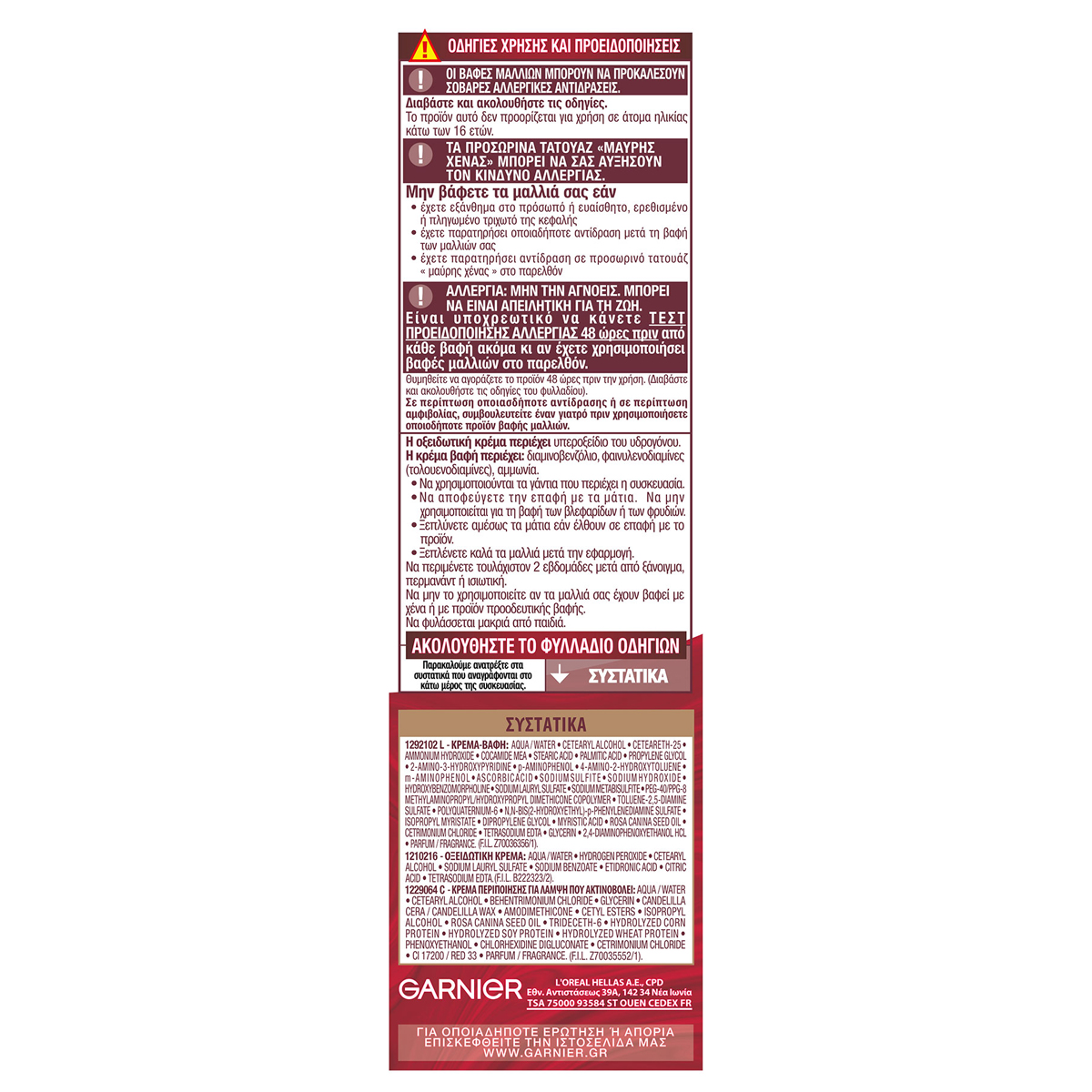 Οι βαφές μπορεί να προκαλέσουν σοβαρές αλλεργικές αντιδράσεις. Δεν προορίζεται για χρήση σε άτομα κάτω των 16 ετών. Τα προσωρινά τατουάζ μαύρης χένας μπορεί να αυξήσουν τον κίνδυνο αλλεργίας. Μη βάφετε τα μαλλιά σας, αν: