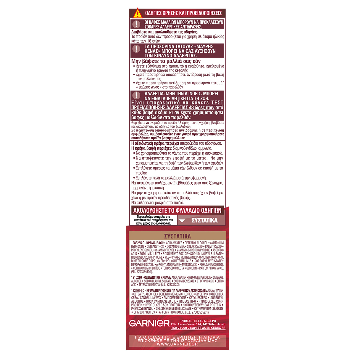 Οι βαφές μπορεί να προκαλέσουν σοβαρές αλλεργικές αντιδράσεις. Δεν προορίζεται για χρήση σε άτομα κάτω των 16 ετών. Τα προσωρινά τατουάζ μαύρης χένας μπορεί να αυξήσουν τον κίνδυνο αλλεργίας. Μη βάφετε τα μαλλιά σας, αν: