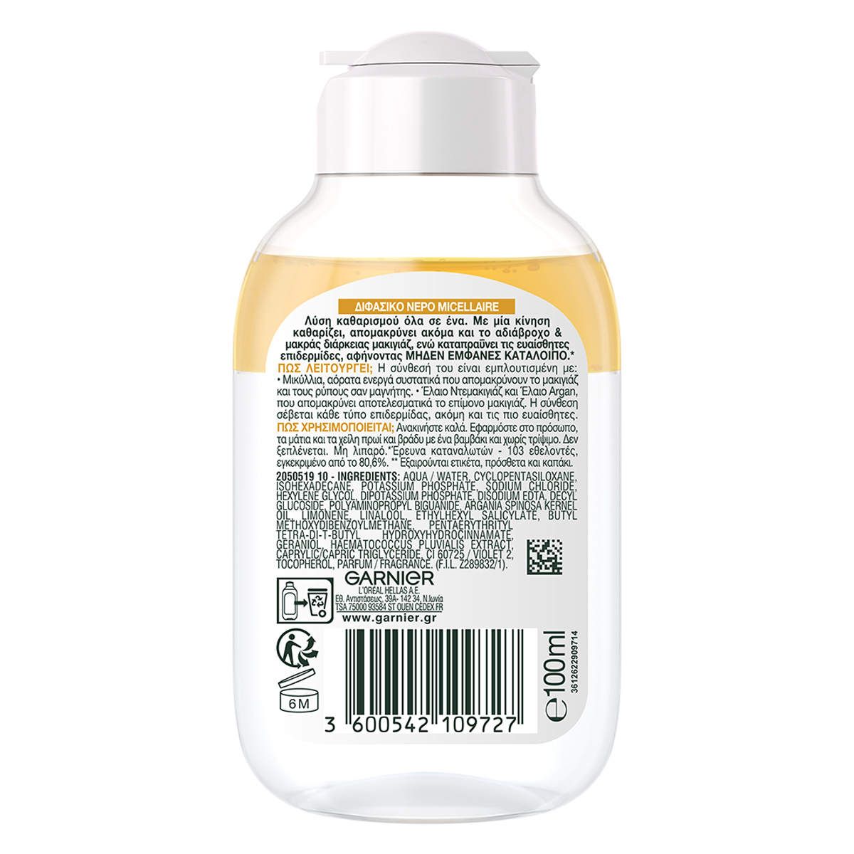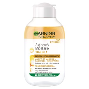 Εάν θέλετε ένα αποτελεσματικό, γρήγορο και εύκολο στη χρήση προϊόν ντεμακιγιάζ, ανακαλύψτε το Διφασικό Νερό Ντεμακιγιάζ Micellaire Όλα σε 1, απο την Garnier. Με μία κίνηση καθαρίζει, απομακρύνει ακόμη και το έντονο ή και αδιάβροχο μακιγιάζ ενώ καταπραΰνει τις ευαίσθητες επιδερμίδες.