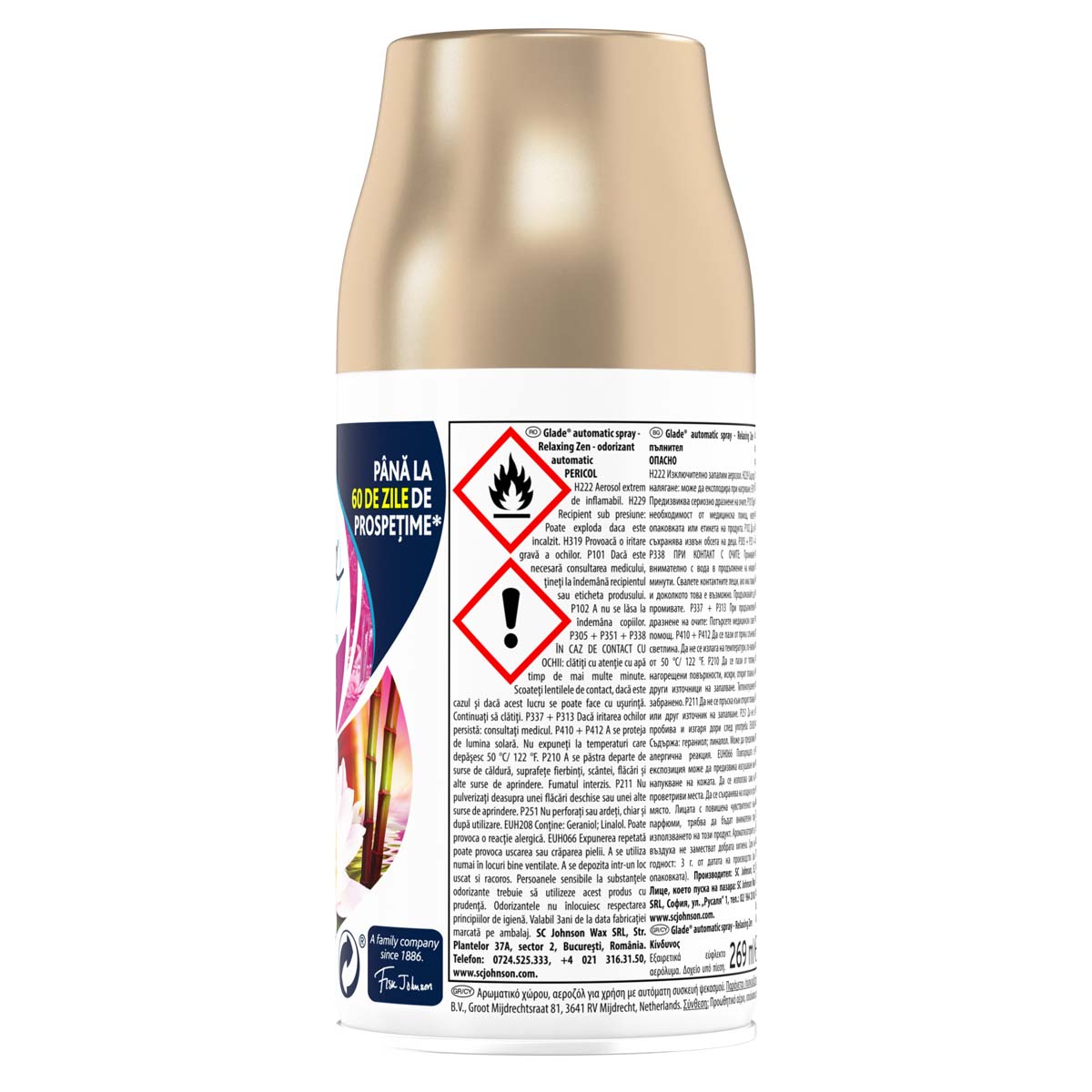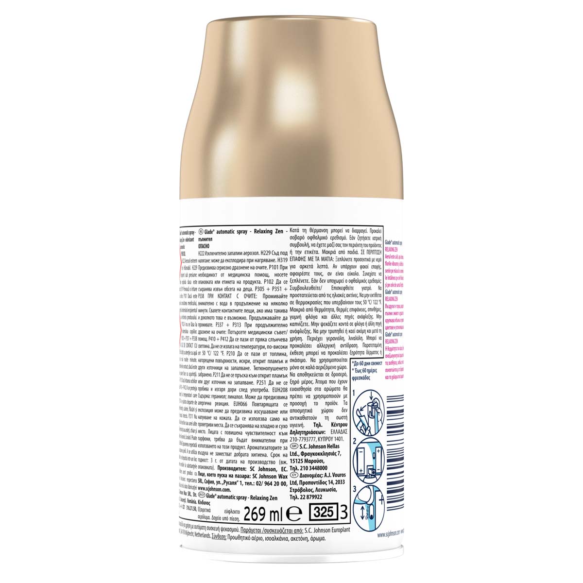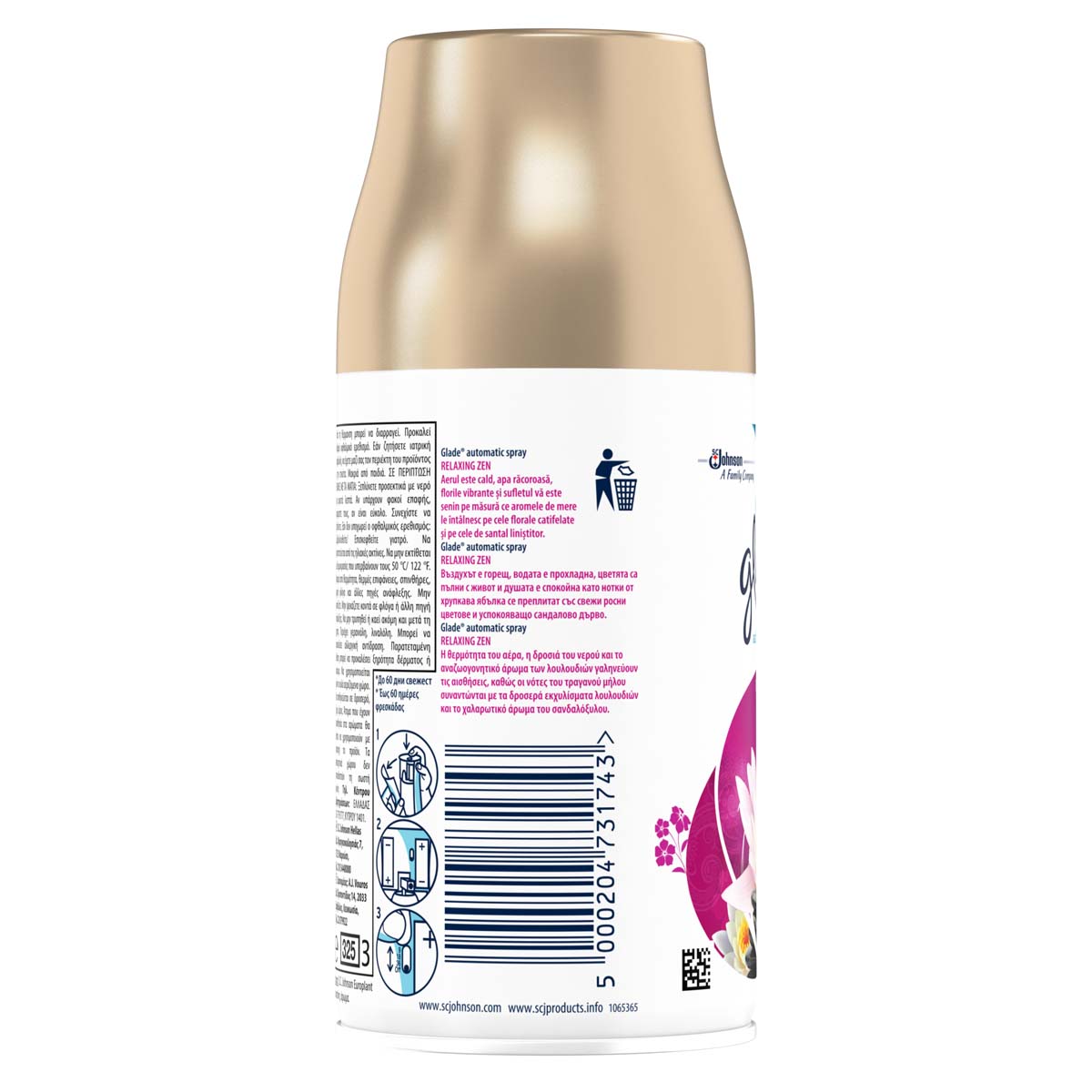 Το Glade® Automatic Spray προσφέρει υπέροχο άρωμα τη μια εβδομάδα μετά την άλλη, αυτόματα. Με 2 τρόπους ψεκασμού: 1. Ρύθμιση χρονοδιακόπτη 2. Κουμπί extra ψεκασμού. RELAXING ZEN: Η θερμότητα του αέρα,η δροσιά του νερού και το αναζωογονητικό άρωμα των λουλουδιών γαληνεύουν τις αισθήσεις, καθώ οι νότες του τραγανού μήλου συναντώνται με τα δροσερά εκχυλίσματα λουλουδιών και το χαλαρό άρωμα του σανδαλόξυλου.