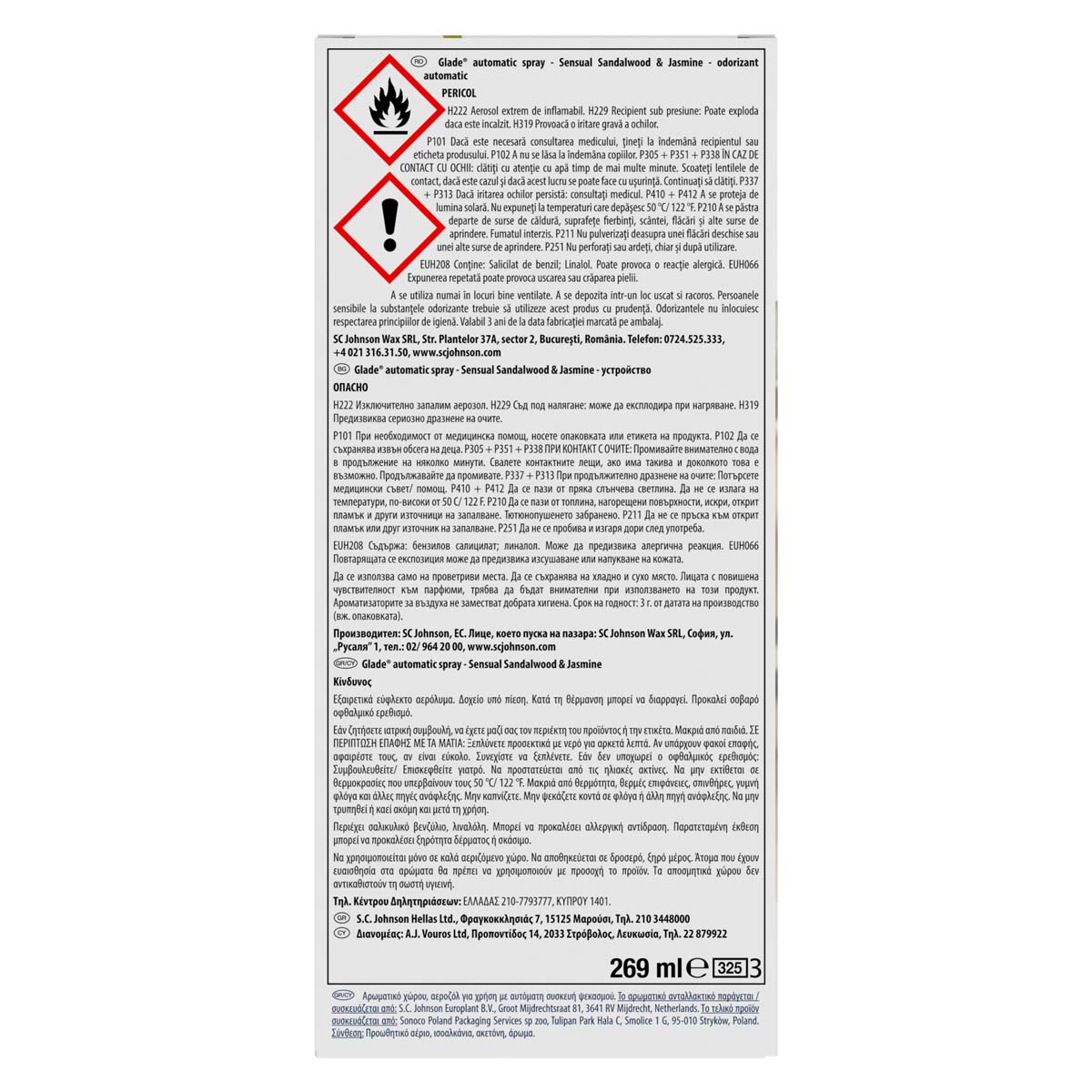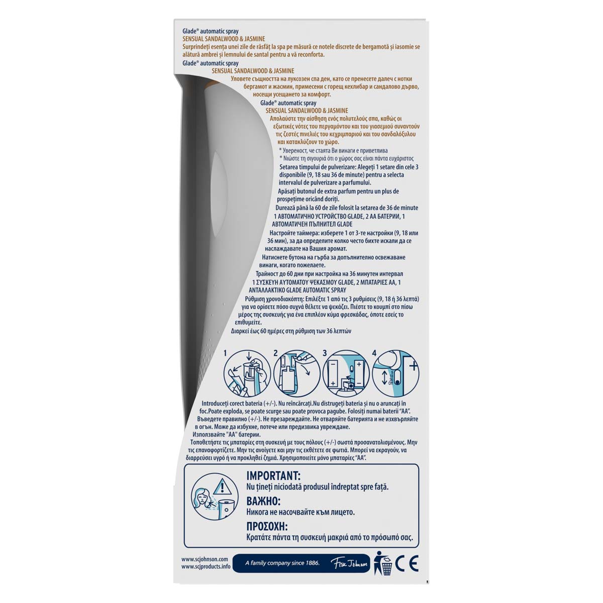 Το Glade® Automatic Spray προσφέρει υπέροχο άρωμα τη μια εβδομάδα μετά την άλλη, αυτόματα. Με 2 τρόπους ψεκασμού: 1. Ρύθμιση χρονοδιακόπτη 2. Κουμπί extra ψεκασμού. SENSUAL SANDALWOOD & JASMINE : Απολαύστε την αίσθηση ενός πολυετλούς σπα, καθώς οι εξωτικές νότες του περγαμόντου και του γιασεμιού συναντούν τις ζεστές πινελιές του κεχριμπαριού και του σανδαλόξυλου και κατακλύζουν το χώρο.