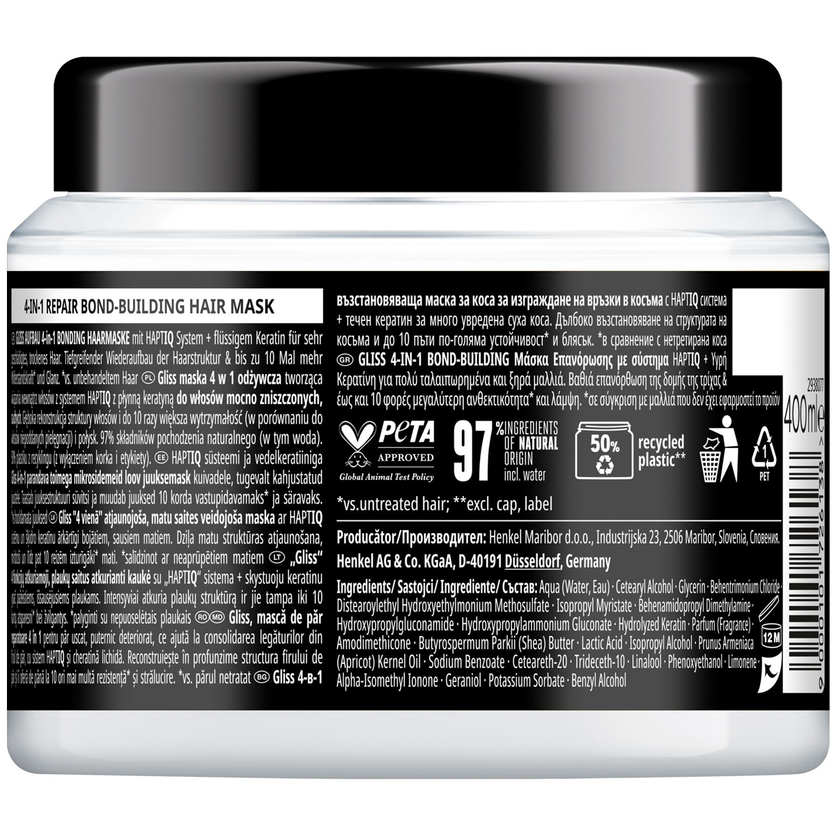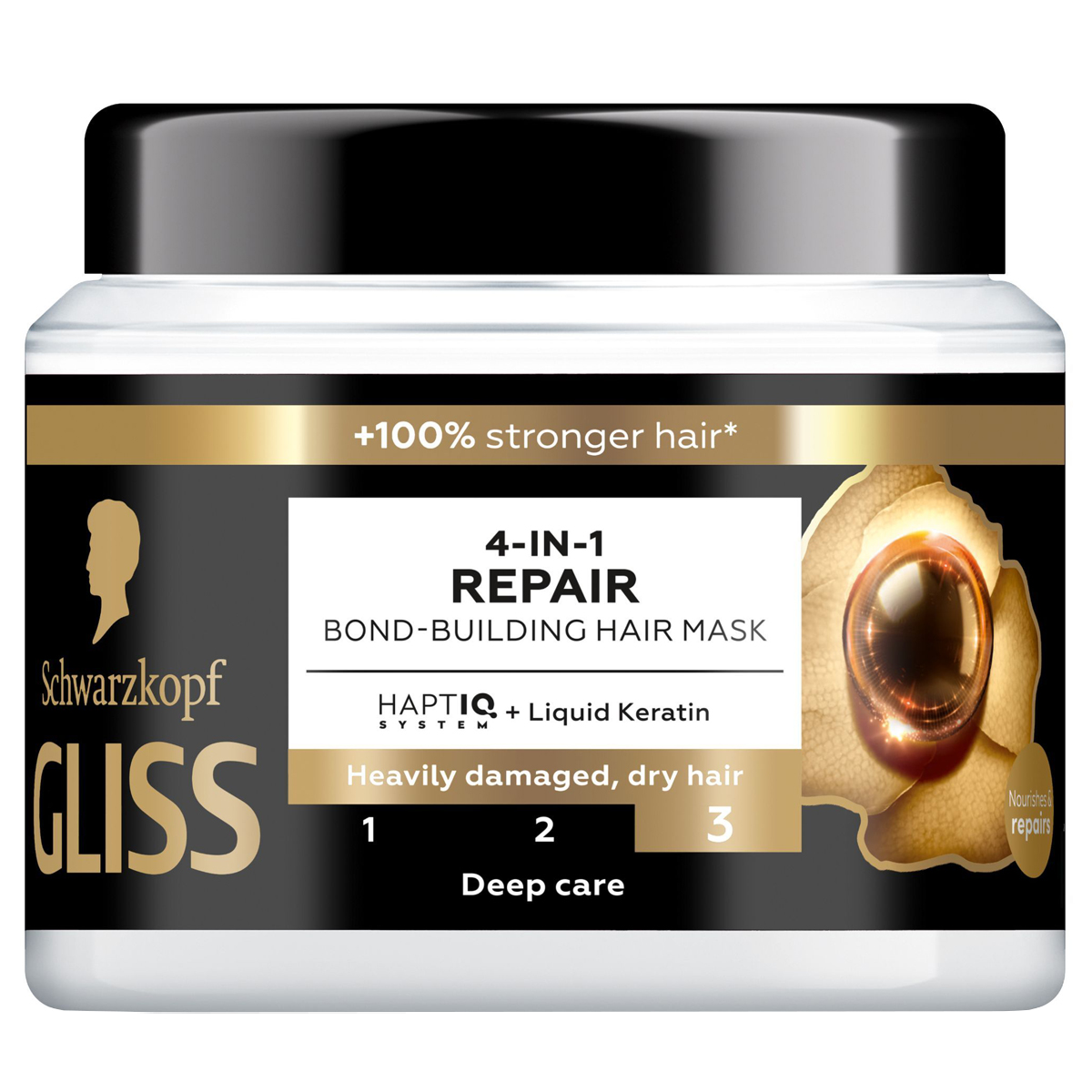 Schwarzkopf Gliss 4-In-1 Repair Bond-Building Μάσκα Μαλλιών 400ml - Μάσκα Επανόρθωσης μαλλιών για πολύ ταλαιπωρημένα, ξηρά μαλλιά. Τα πολύ ταλαιπωρημένα μαλλιά χάνουν συνεχώς την φυσική κερατίνη στα μαλλιά τους, ως αποτέλεσμα αποδυναμώνεται η δομή της τρίχας. Χρειάζεται εντατική επανόρθωση που αναπληρώνει τη χαμένη κερατίνη. Αυτή η μάσκα μαλλιών Gliss συνδυάζει το σύστημα HAPTIQ και την υγρή κερατίνη για να προσφέρει βαθιά επανόρθωση και λάμψη στα μαλλιά. Με την ελαφριά κρεμώδη υφή της, προσφέρει έντονη θρέψη, ενώ αφήνει τα μαλλιά δυνατά και λαμπερά. Αναδομεί σε βάθος τη δομή της τρίχας για έως και 10 φορές μεγαλύτερη ανθεκτικότητα & λάμψη. Gliss Care Level: 3 - Εντατική φροντίδα, με φόρμουλες επανόρθωσης και συστατικά υψηλής απόδοσης. Αυτή η μάσκα μαλλιών κερατίνης με σύστημα HAPTIQ δημιουργεί μικροδεσμούς και ενισχύει τη δομή της τρίχας. Για όμορφα μαλλιά με αποτέλεσμα που μπορείς να δεις και να αισθανθείς. Με πλούσιο αισθησιακό άρωμα. Το 97% των συστατικών είναι φυσικής προέλευσης. Τα προϊόντα μαλλιών Gliss είναι εγκεκριμένα από την PETA. Το σώμα του βάζου είναι κατασκευασμένο από 50% ανακυκλωμένο πλαστικό.