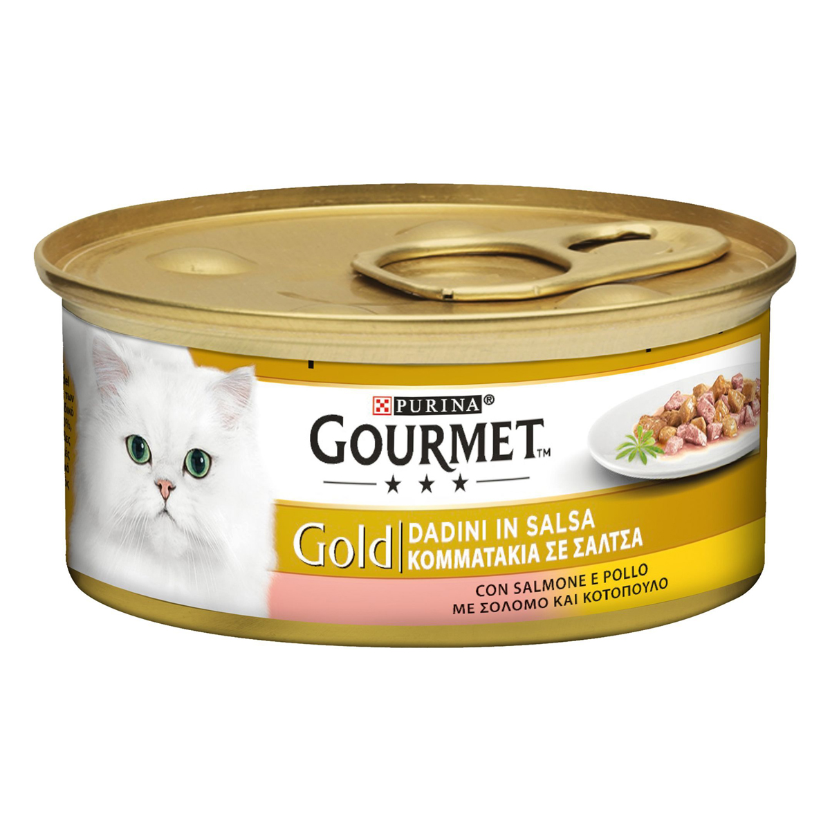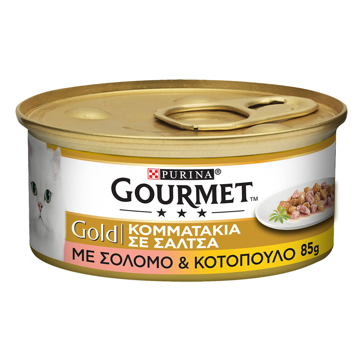 Η γάτα σας είναι ένας αληθινός γευσιγνώστης που λατρεύει να δοκιμάζει διαφορετικές συνταγές και γεύσεις. Γι αυτό το λόγο η Gourmet Gold δημιούργησε τη σειρά Κομματάκια σε Σάλτσα: εκλεπτυσμένες συνταγές που θα προσφέρουν στη γάτα σας καθημερινά μια διαφορετική γευστική εμπειρία. Η Gourmet Gold με Σολομό και Κοτόπουλο είναι μία πλήρης τροφή για ενήλικες γάτες. Τρυφέρα κομματάκια με κρέας και ψάρι εξαιρετικά μαγειρεμένα με την σάλτσα τους θα ικανοποιήσουν και τους πιο απαιτητικούς ουρανίσκους. Κομματάκια σε Σάλτσα από την Gourmet Gold, μια επιλογή από εξαιρετικές συνταγές που προσφέρουν μια διαφορετική γευστική εμπειρία κάθε μέρα.