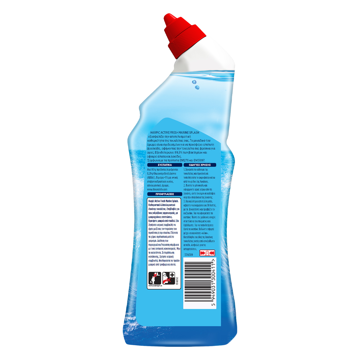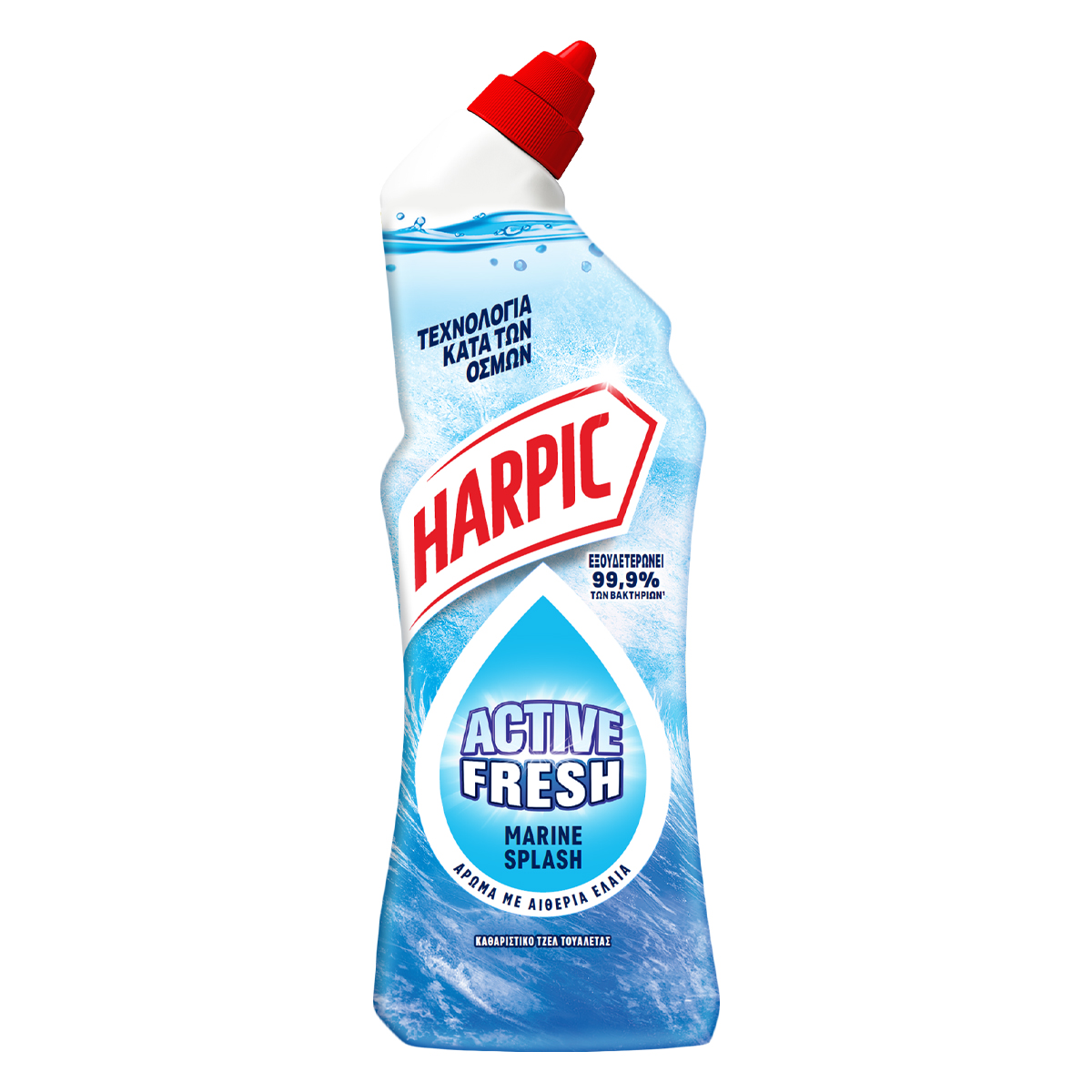 To HARPIC ACTIVE FRESH MARINE SPLASH εξασφαλίζει αποτελεσματική καθαριότητα στην τουαλέτα σας. Το μοναδικό του άρωμα αφήνει φρεσκάδα στην τουαλέτα σας για ώρες. Επιπλέον, εξουδετερώνει το 99,9% των βακτηρίων και παράλληλα αφαιρεί άλατα και λεκέδες.