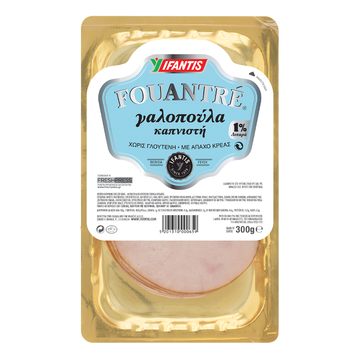 Από εκλεκτό φιλέτο γαλοπούλας. Πλούσια γεύση, με μόνο 1% λιπαρά και υψηλή περιεκτικότητα σε πρωτεΐνη. Από ατόφια, ολόκληρα κομμάτια εκλεκτού φιλέτου γαλοπούλας καπνισμένα με υπομονή και μεράκι σε διαλεχτά κομμάτια οξιάς, που αναδεικνύει τα ιδιαίτερα γευστικά του χαρακτηριστικά και του χαρίζει την πλούσια και μοναδική γεύση Fouantre. Συσκευάζεται με την πρωτοποριακή τεχνολογία FRESHPRESS που προσφέρει την καλύτερη δυνατή προστασία και σιγουριά στην παραγωγή τροφίμων, διατηρώντας αναλλοίωτη τη γεύση και τα θρεπτικά συστατικά τους για μεγαλύτερο χρονικό διάστημα μετά το άνοιγμα της συσκευασίας. Με την εγγύηση ποιότητας Ifantis.