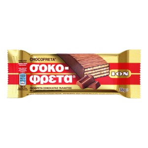 Τραγανή, φρέσκια βάφλα βουτηγμένη σε πλούσια σοκολάτα ΙΟΝ. Είναι η Σοκοφρέτα! Η μοναδική βάφλα της αλλά και η γνήσια σοκολάτα ΙΟΝ που την 'αγκαλιάζει', την έχουν αναδείξει στην.. μια και μοναδική σου γκοφρέτα!