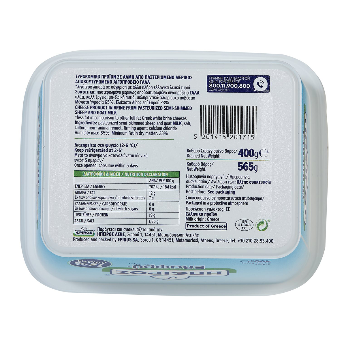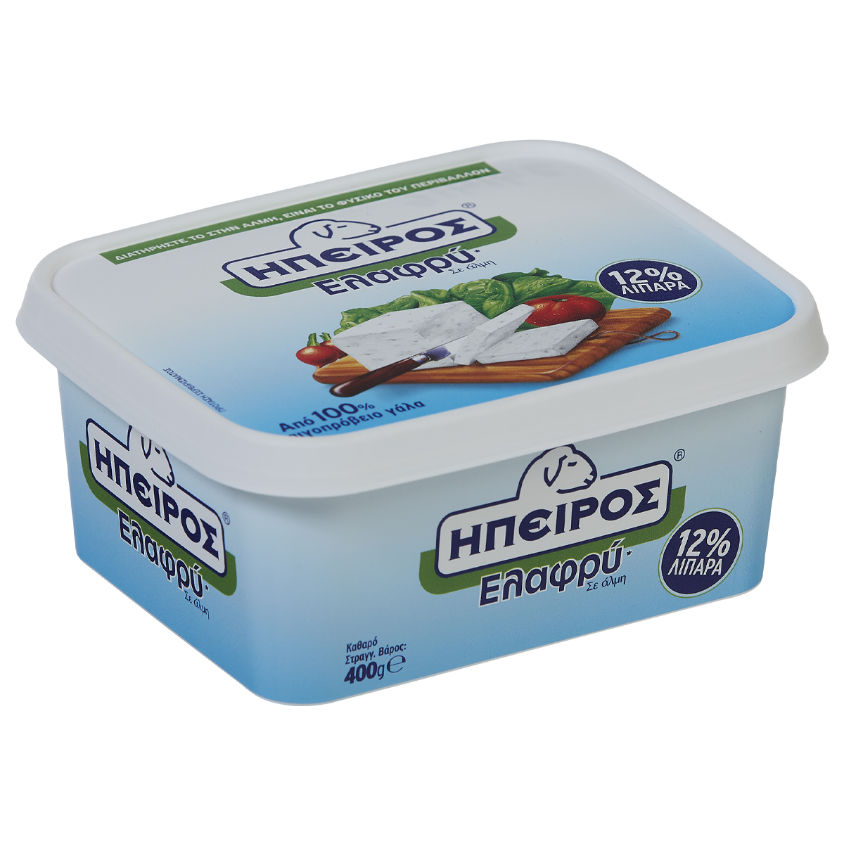 Το ΗΠΕΙΡΟΣ ελαφρύ είναι λευκό τυρί σε άλμη, με μόλις 12% λιπαρά. Παρασκευάζεται από 100% αιγοπρόβειο γάλα.Το ΗΠΕΙΡΟΣ Ελαφρύ περιέχει μόνο 56 θερμίδες και 3,6γρ λιπαρά ανά 30γρ (μερίδα) προϊόντος, ενώ είναι πλούσιο σε πρωτεΐνες, ασβέστιο και βιταμίνες. Μπορείτε να το απολαμβάνετε καθημερινά σε σαλάτες, λαδερά, όσπρια, πίτες κλπ.
