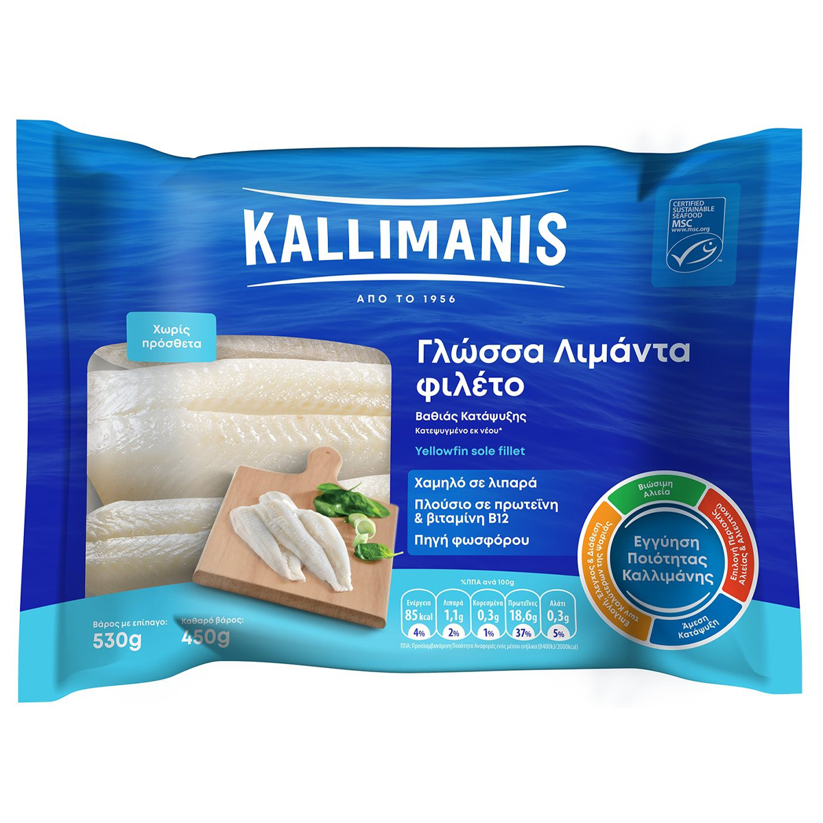 Η γλώσσα φιλέτο Kallimanis, δεν έχει πρόσθετα ή συντηρητικά, εξασφαλίζοντας όλη τη φρεσκάδα και τη θρεπτική αξία της θάλασσας .Η λεπτή της γεύση την κάνει ιδιαίτερα αγαπητή σε παιδιά και σε όσους είναι ευαίσθητοι στη μυρωδιά του ψαριού. Διαλέγουμε με μεγάλη προσοχή τα καλύτερα της ψαριάς και σας προσφέρουμε αγνά φιλέτα γλώσσας χωρίς δέρμα και κόκκαλα σε συσκευασία 530γρ. Η γλώσσα είναι πλούσια σε πρωτεΐνες και αποτελεί φυσική πηγή φωσφόρου και βιταμίνης Β12.