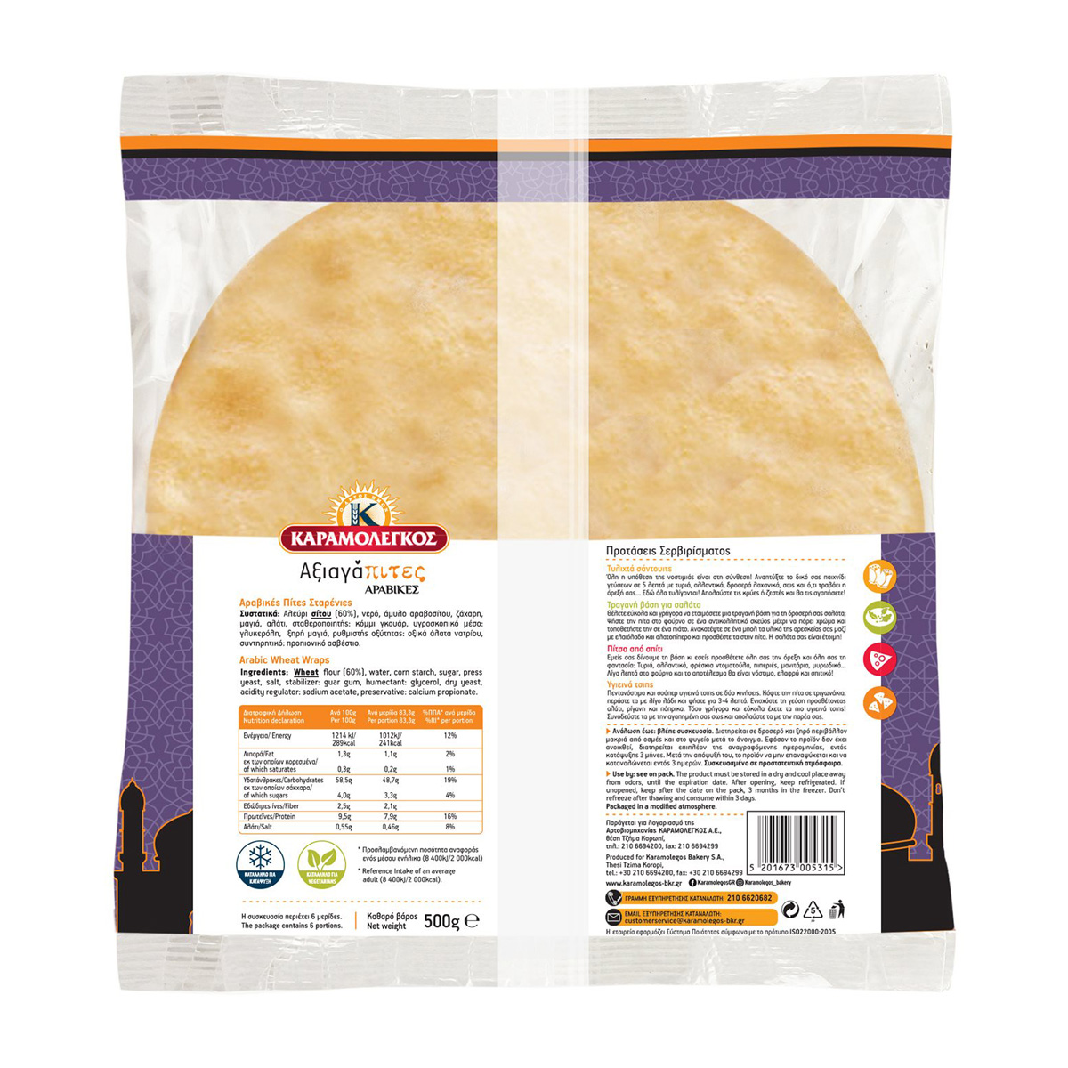 Συνδυάστε υλικά και ιδέες πάνω σε μεγάλες αραβικές πίτες. Δοκιμάστε κάτι διαφορετικό κάθε μέρα και απολαύστε ένα πλούσιο και χορταστικό γεύμα με τις Αξιαγάπιτες αραβικές Καραμολέγκος. Συνδυάστε τες με κοτόπουλο, λαχανικά ή μπιφτέκι, τυρί ή αλλαντικά και αφήστε τον νου σας να δημιουργήσει.