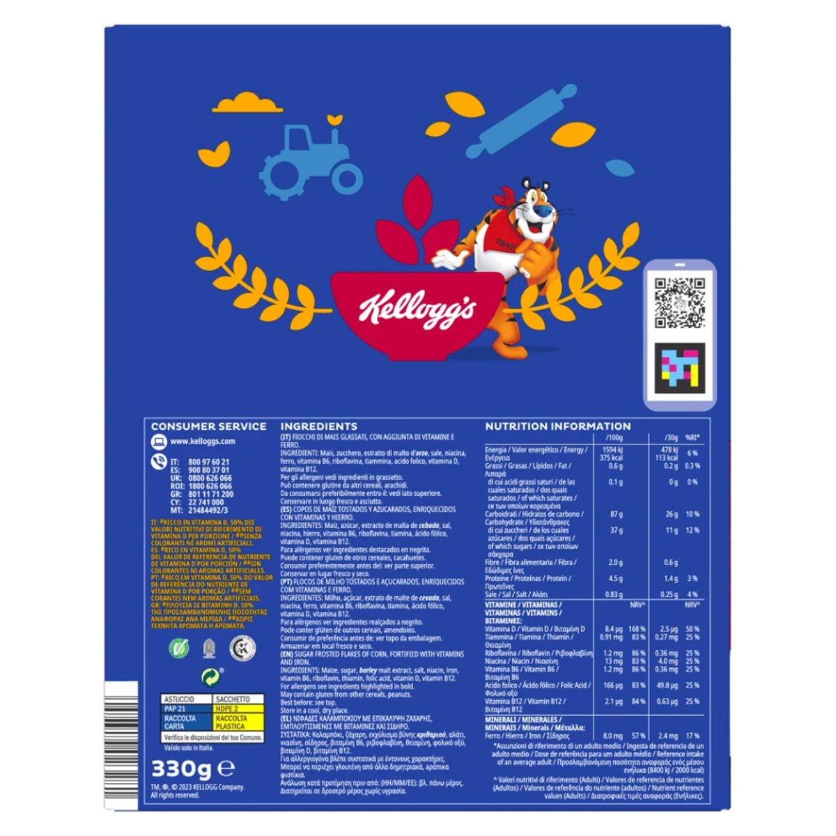Νιφάδες καλαμποκιού με επικάλυψη ζάχαρης. Έξτρα τραγανές νιφάδες καλαμποκιού με 8 βιταμίνες και μέταλλα.