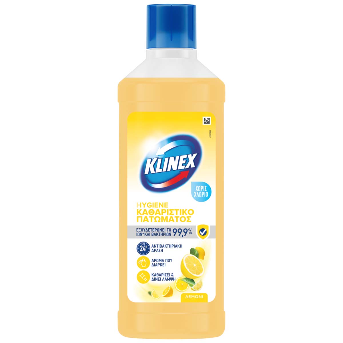 Το Klinex Hygiene Καθαριστικό Πατώματος Λεμόνι απολυμαίνει σε βάθος χωρίς χλώριο και αφήνει υπέροχο άρωμα φρεσκάδας που διαρκεί σε μικρές και μεγάλες επιφάνειες! Πιο συγκεκριμένα, η ειδική σύνθεσή του χωρίς χλώριο, εξουδετερώνει το 99,9% των βακτηρίων και τις αιτίες αλλεργιών και το καθιστά ιδανικό ακόμα και για καθημερινή χρήση. Με τα Klinex Hygiene Καθαριστικά Πατώματος, μπορείτε να είστε σίγουροι ότι χαρίζετε υγιεινή καθαριότητα σε κάθε επιφάνεια και έτσι, να απολαμβάνετε το σπίτι σας κάθε στιγμή ξέγνοιαστα! * Βάσει εργαστηριακών τεστ ΕΝ **Χρησιμοποιείτε τα βιοκτόνα προϊόντα με ασφαλή τρόπο. Διαβάζετε πάντοτε την ετικέτα και τις πληροφορίες σχετικά με το προϊόν πριν από τη χρήση.