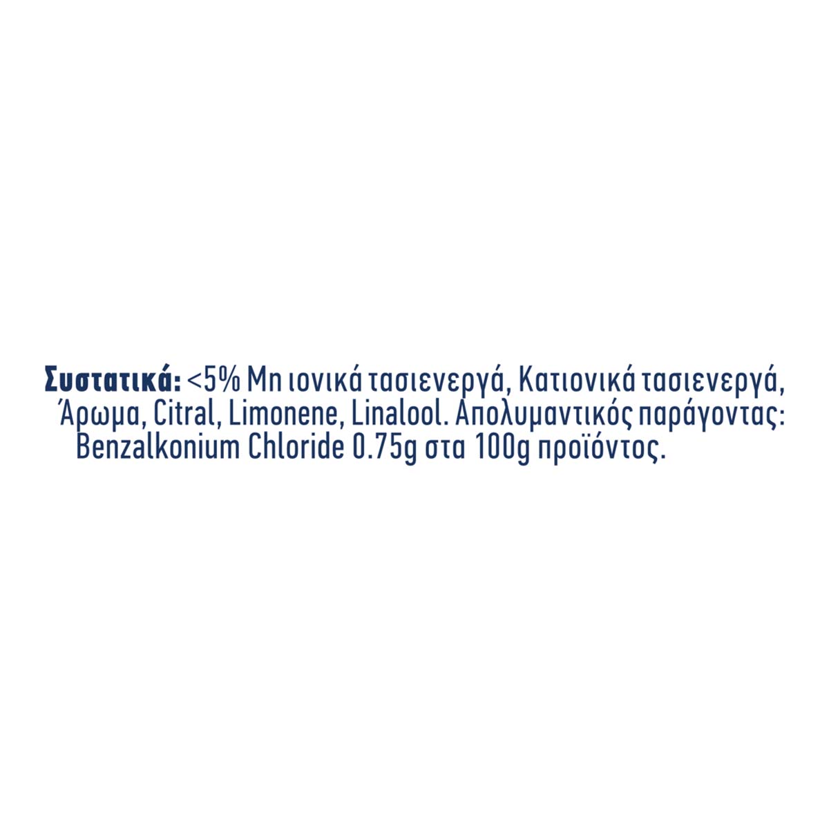 <5 % Μη ιονικά τασιενεργά, Κατιονικά τασιενεργά, Άρωμα. Απολυμαντικός παράγοντας: Benzalkonium chloride 0,75g στα 100g.