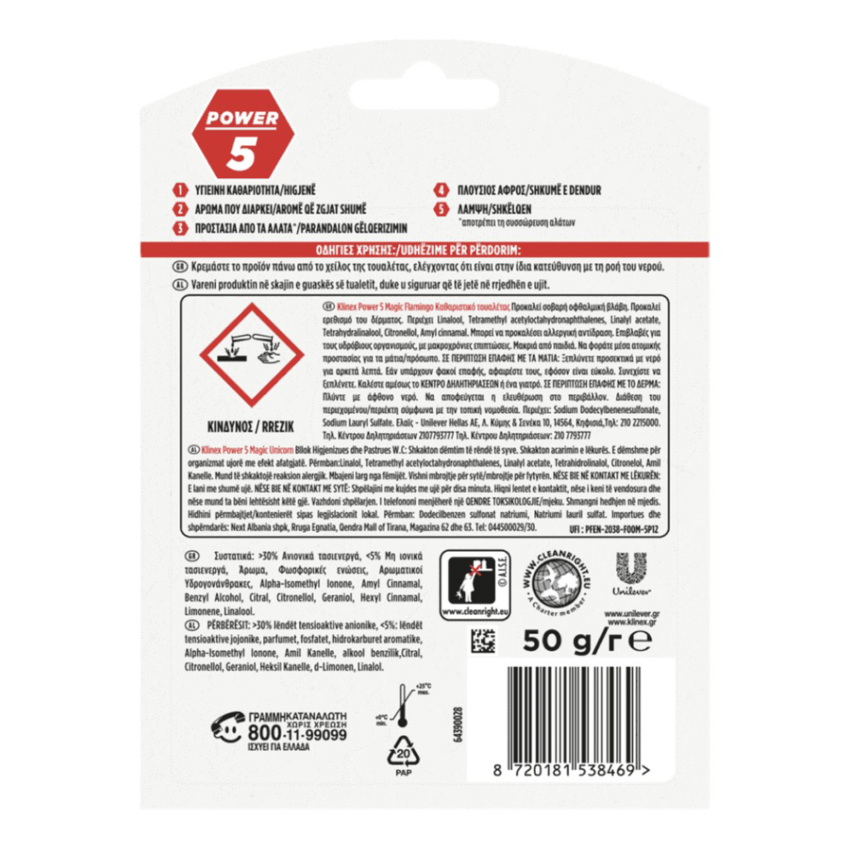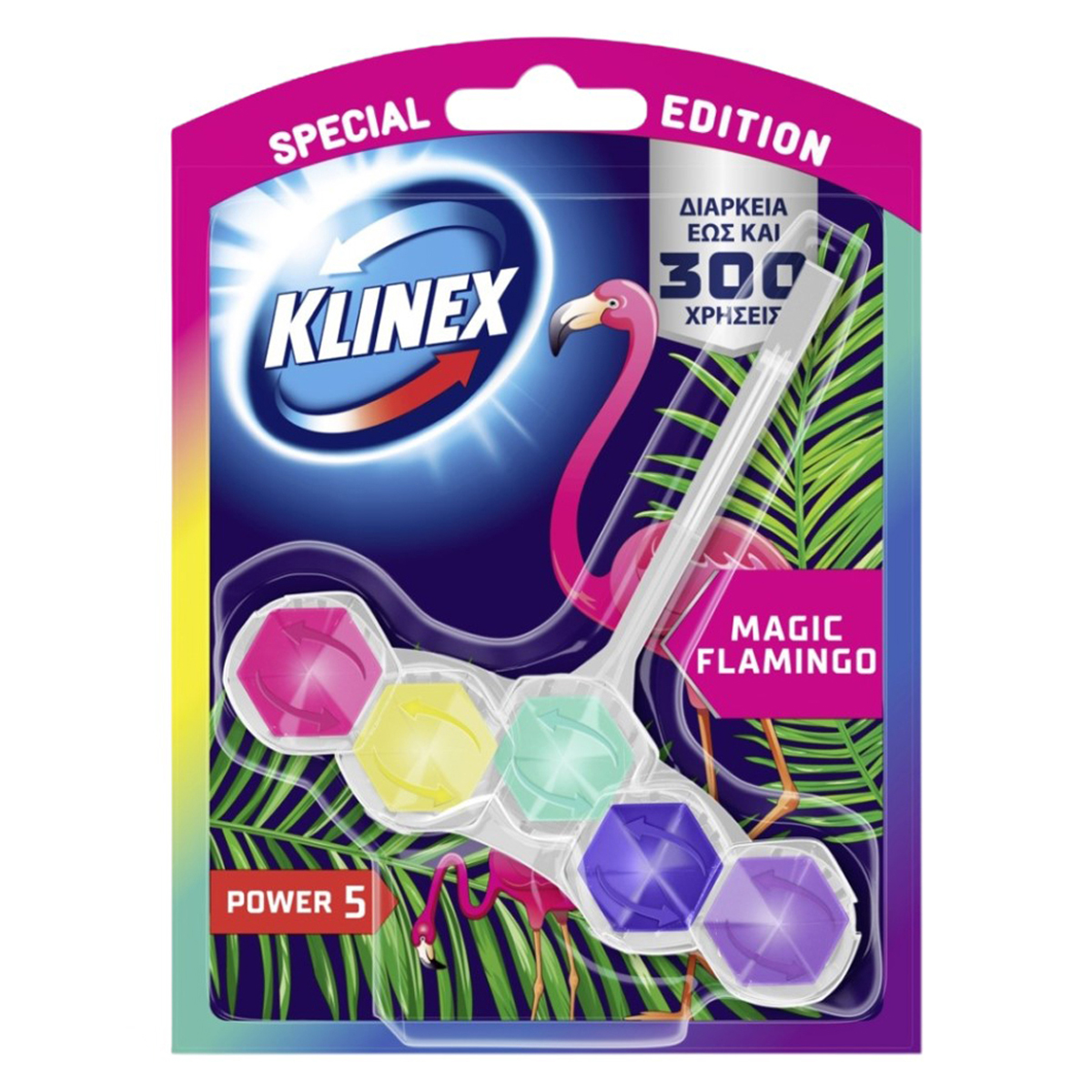Τα Klinex WC Block Power 5 συνδυάζουν 5 δράσεις σε 1 χρήση! Έτσι, κάθε φορά που τραβάτε το καζανάκι, απελευθερώνεται η ειδική σύνθεσή τους, που αποτρέπει τη συσσώρευση αλάτων και διατηρεί την τουαλέτα σας υγιεινά καθαρή! Επιπλέον δημιουργούν πλούσιο αφρό και διατηρούν για μεγαλύτερο χρονικό διάστημα τη λεκάνη της τουαλέτας σας λαμπερή και καθαρή! Διαρκούν έως και 300 χρήσεις.