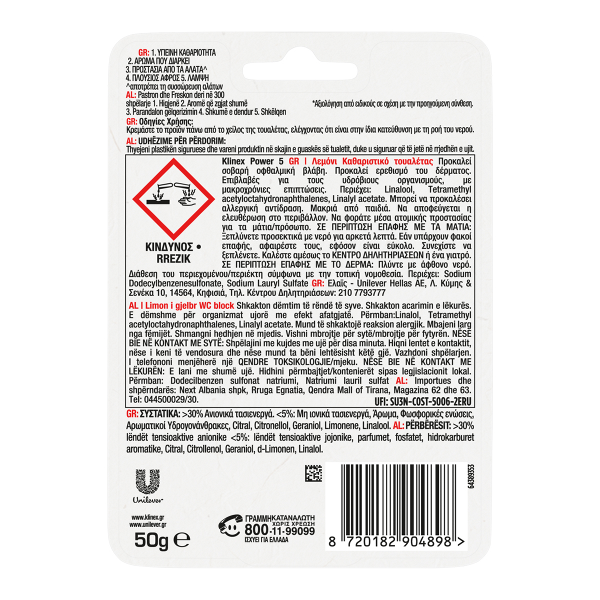 Τα Klinex WC Block Power 5 συνδυάζουν 5 δράσεις σε 1 χρήση! Έτσι, κάθε φορά που τραβάτε το καζανάκι, απελευθερώνεται η ειδική σύνθεσή τους, που αποτρέπει τη συσσώρευση αλάτων και διατηρεί την τουαλέτα σας υγιεινά καθαρή! Επιπλέον δημιουργούν πλούσιο αφρό και διατηρούν για μεγαλύτερο χρονικό διάστημα τη λεκάνη της τουαλέτας σας λαμπερή και καθαρή! Διάρκεια έως και 300 χρήσεις.