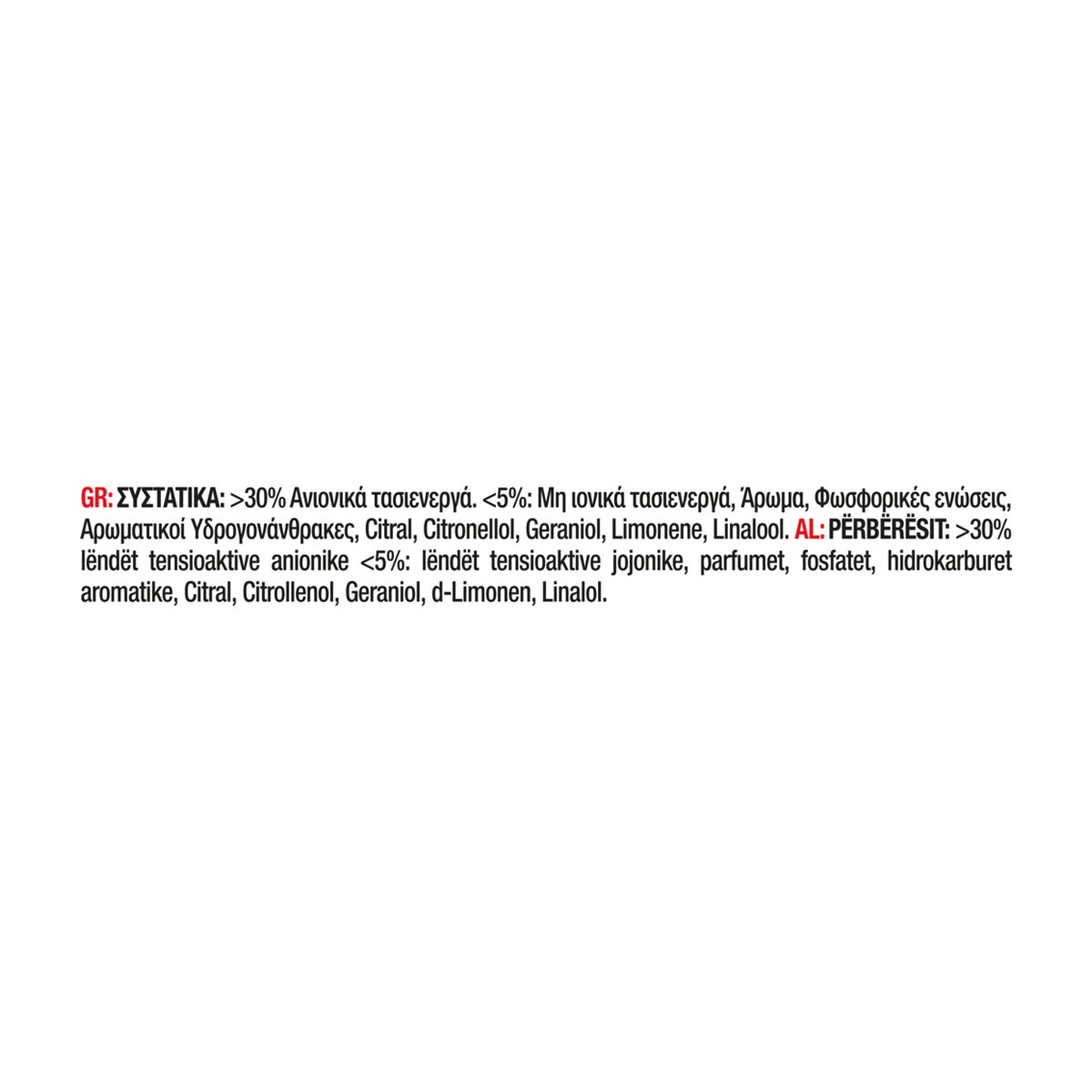 >30% Ανιονικά τασιενεργά, <5% Μη ιονικά τασιενεργά, Άρωμα, Αρωματικοί υδρογονάνθρακες, Φωσφορικές ενώσεις, Linalool, Citral, Limonene.