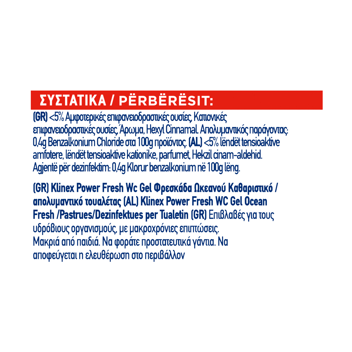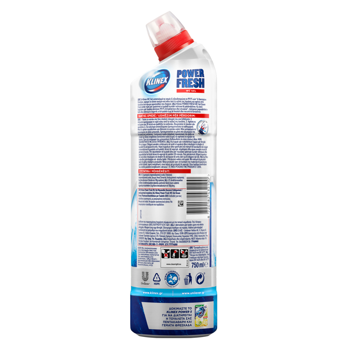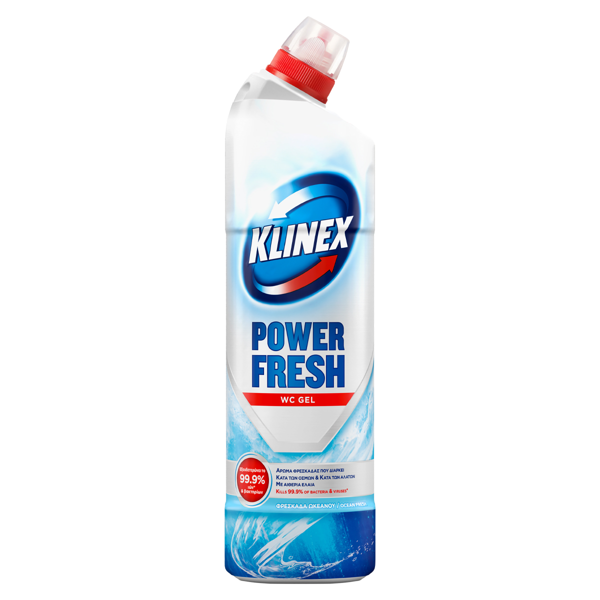 To Klinex WC Gel Φρεσκάδα Ωκεανού, με βιοδιασπώμενο άρωμα, καταπολεμά τις οσμές & εξουδετερώνει το 99,9% ιών* & βακτηρίων. Επιπλέον, αφαιρεί τα άλατα ακόμα και κάτω από το χείλος της λεκάνης και αφήνει στη τουαλέτα ένα άρωμα φρεσκάδας που διαρκεί.