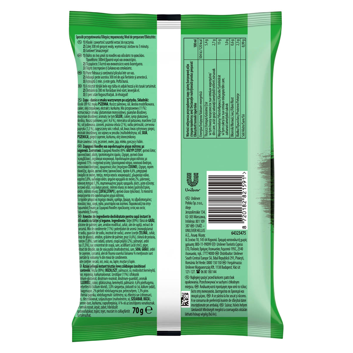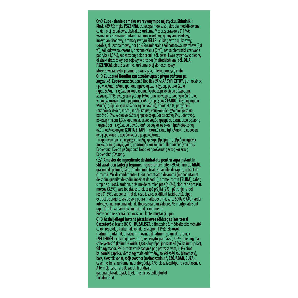 Ζυμαρικά Noodles 89%: ΑΛΕΥΡΙ ΣΙΤΟΥ, φυτικό λίπος (φοινικέλαιο), αλάτι, τροποποιημένο άμυλο, ζάχαρη, φυτικό έλαιο (κραμβέλαιο), εκχύλισμα κουρκουμά. Αφυδατωμένο μίγμα σάλτσας με λαχανικά 11%: ενισχυτικά γεύσης (γλουταμινικό νάτριο, ινοσινικό δινάτριο, γουανυλικό δινάτριο), αρωματικές ύλες (περιέχουν ΣΕΛΙΝΟ), ζάχαρη, σιρόπι γλυκόζης, άμυλο, φυτικό λίπος (φοινικέλαιο), πράσο 4,6%, μπαχαρικά (σκόρδο σε σκόνη, πιπέρι, πιπέρι καγιέν, κουρκουμάς), χλωριούχο κάλιο, καρότα 3,8%, ιωδιούχο αλάτι, ψημένο κρεμμύδι σε σκόνη 2%, μαϊντανός, κόκκινη πιπεριά 1,3%, συμπυκνωμένος χυμός κρεμμύδι, αλάτι, μέσο οξίνισης (κιτρικό οξύ), εκχύλισμα μαγιάς, σάλτσα σόγιας σε σκόνη [μαλτοδεξτρίνη, αλάτι, σάλτσα σόγιας (ΣΟΓΙΑ,ΣΙΤΑΡΙ)], φυτικό έλαιο (ηλιέλαιο). Τα ποσοστά αναφέρονται στο αφυδατωμένο μίγμα σάλτσας.