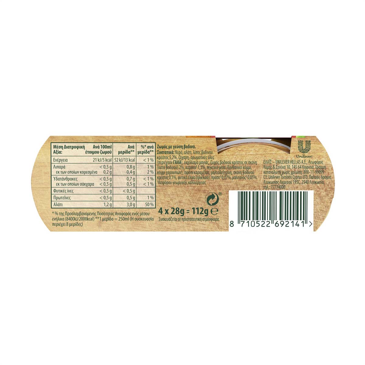 Ο Knorr «Σπιτικός» Ζωμός είναι ένας υψηλής ποιότητας ζωμός, εμπνευσμένος από τον παραδοσιακό, σπιτικό τρόπο παρασκευής ζωμού. Ένας αρμονικός & γευστικά πλούσιος συνδυασμός προσεκτικά επιλεγμένων συστατικών, που έχουν βράσει σε χαμηλή φωτιά για αρκετή ώρα, συμπυκνώνεται πρωτοποριακά σε μια μικρή συσκευασία.