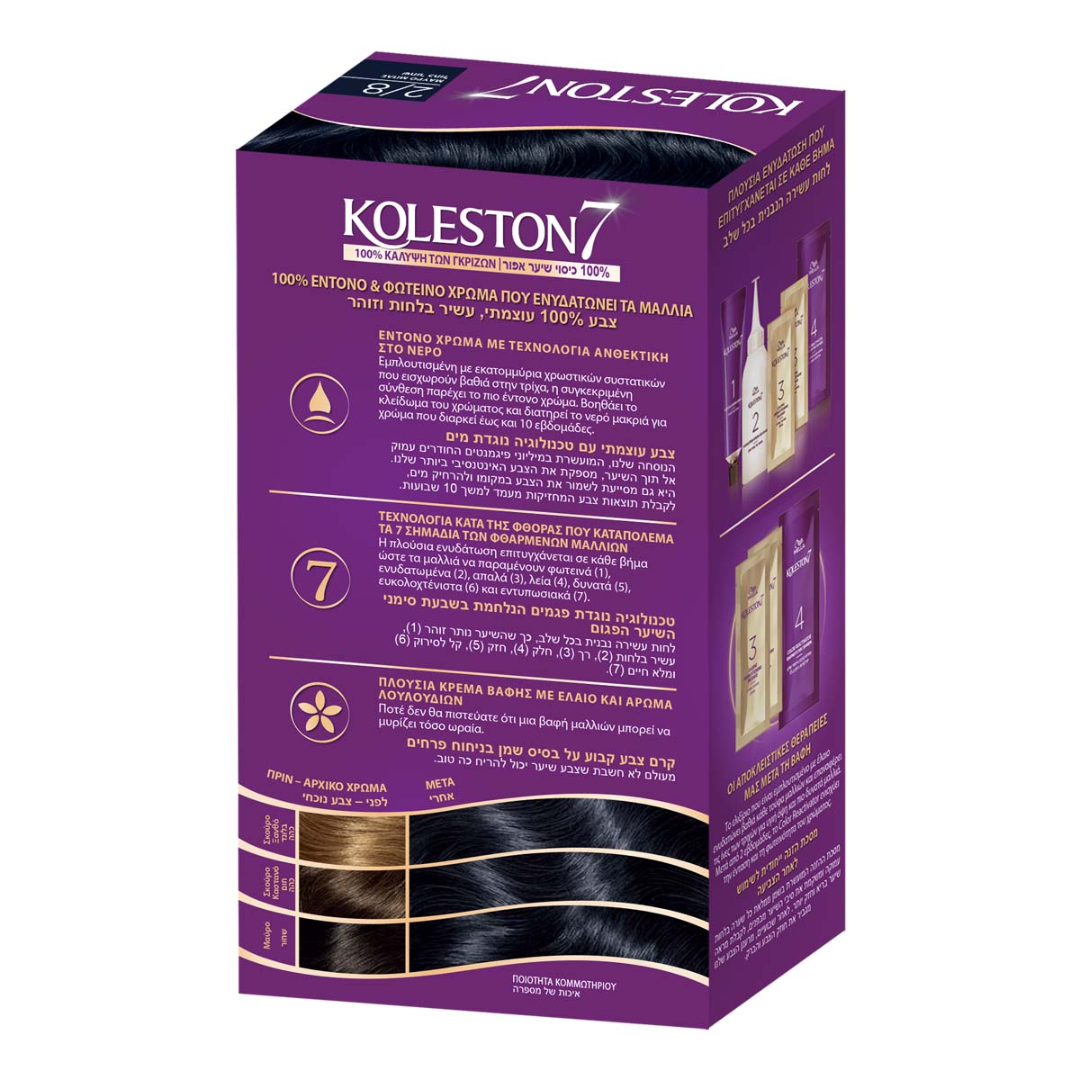 Νέα KOLESTON Κρέμα βαφή 2/8 - Μαύρο Μπλέ για 100% κάλυψη των γκρίζων, με ελιξίριο εμπλουτισμένο με έλαιο και βελτιωμένη σύνθεση για πλούσια ενυδάτωση που επιτυγχάνεται σε κάθε βήμα. Με τεχνολογία ανθεκτική στο νερό, εμπλουτισμένη με εκατομμύρια χρωστικών συστατικών που εισχωρούν βαθιά στην τρίχα, η συγκεκριμένη σύνθεση παρέχει το πιο έντονο χρώμα. Βοηθάει το κλείδωμα του χρώματος και διατηρεί το νερό μακριά, για χρώμα που διαρκεί έως και 10 εβδομάδες. Καταπολεμά τα 7 σημάδια των φθαρμένων μαλλιών, ώστε τα μαλλιά να παραμένουν φωτεινά, ενυδατωμένα, απαλά, λεία, δυνατά, ευκολοχτένιστα και εντυπωσιακά. Με υπέροχο άρωμα λουλουδιών