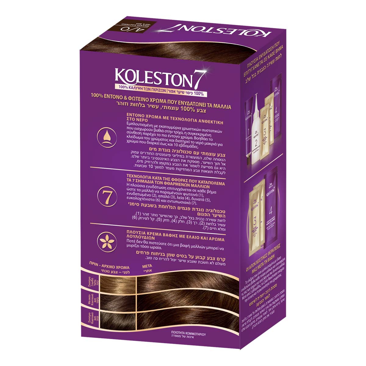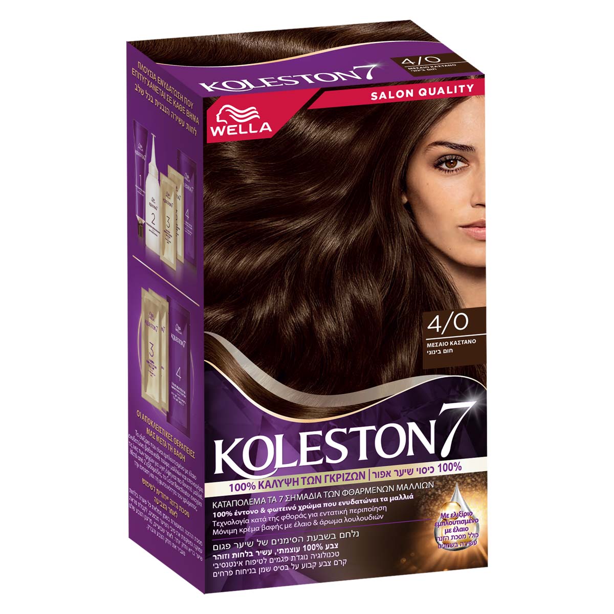 Νέα KOLESTON Κρέμα βαφή 4/0 - Μεσαίο Καστανό για 100% κάλυψη των γκρίζων, με ελιξίριο εμπλουτισμένο με έλαιο και βελτιωμένη σύνθεση για πλούσια ενυδάτωση που επιτυγχάνεται σε κάθε βήμα. Με τεχνολογία ανθεκτική στο νερό, εμπλουτισμένη με εκατομμύρια χρωστικών συστατικών που εισχωρούν βαθιά στην τρίχα, η συγκεκριμένη σύνθεση παρέχει το πιο έντονο χρώμα. Βοηθάει το κλείδωμα του χρώματος και διατηρεί το νερό μακριά, για χρώμα που διαρκεί έως και 10 εβδομάδες. Καταπολεμά τα 7 σημάδια των φθαρμένων μαλλιών, ώστε τα μαλλιά να παραμένουν φωτεινά, ενυδατωμένα, απαλά, λεία, δυνατά, ευκολοχτένιστα και εντυπωσιακά. Με υπέροχο άρωμα λουλουδιών
