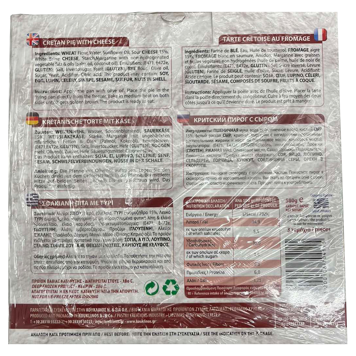 Αλεύρι ΣΙΤΟΥ, νερό, ηλιέλαιο, ΤΥΡΙ ξινομυζήθρα 15%, λευκό ΤΥΡΙ άλμης, άμυλο, μαργαρίνη με μη υδρογονωμένα φυτικά λίπη & έλαια (φοινικέλαιο, έλαιο καρύδας), γαλακτωματοποιητές: (Ε471, Ε472e, ΓΛΟΥΤΕΝΗ), αλάτι, ιμβερτοζάχαρο, προζύμι (ΓΛΟΥΤΕΝΗ), αλεύρι ΣΙΚΑΛΗΣ, ελαιόλαδο, ζάχαρη, μαγιά, μέσο οξίνισης: κιτρικό οξύ.